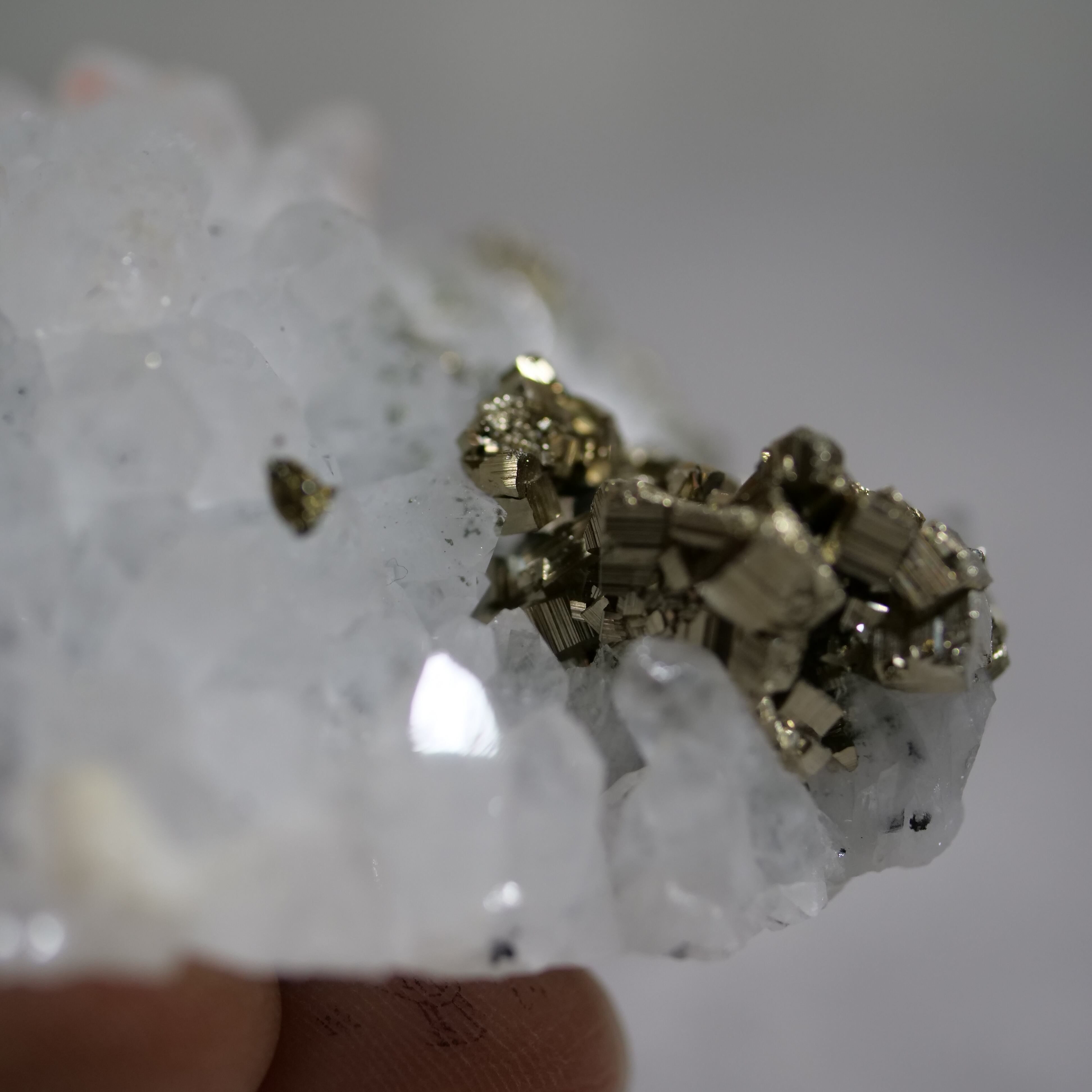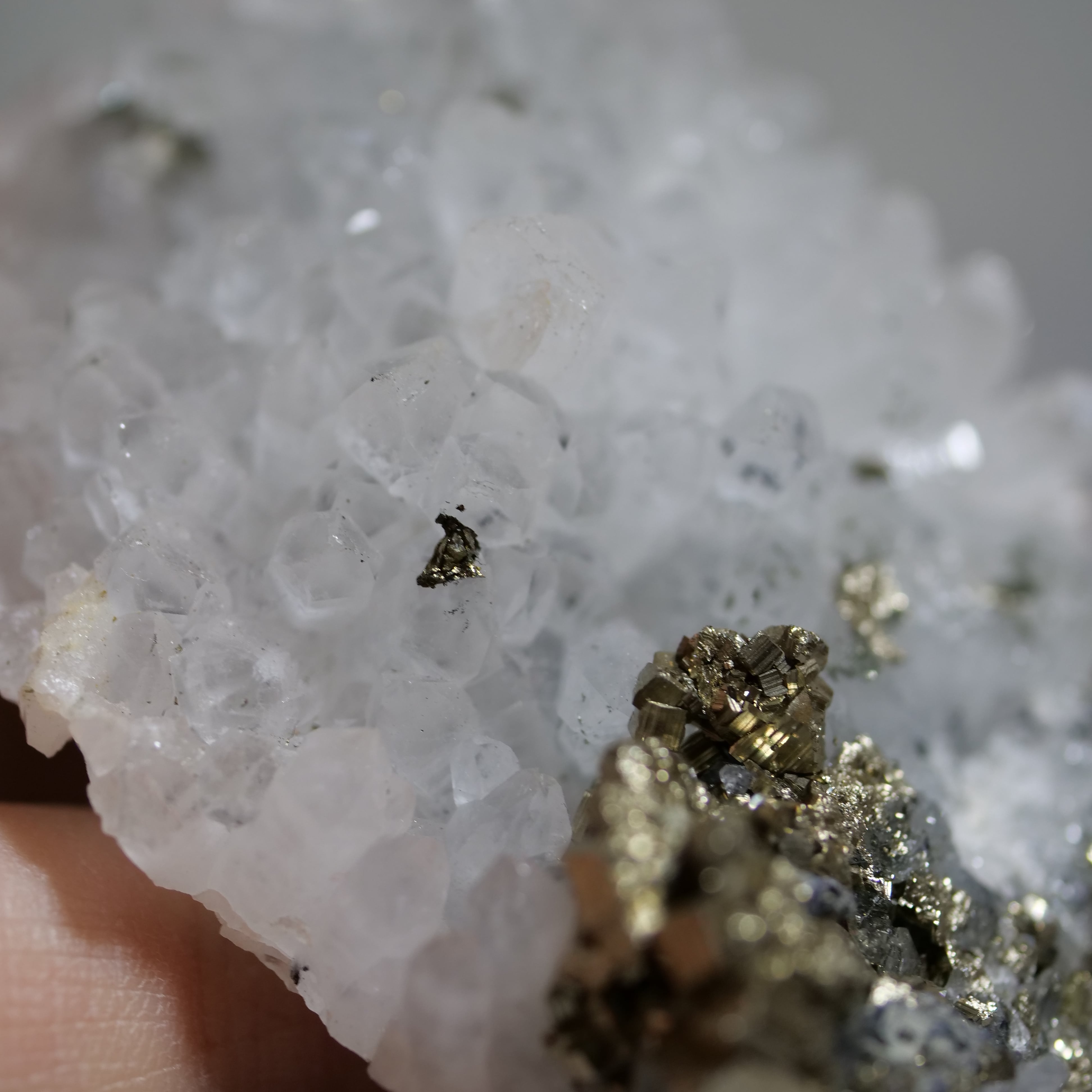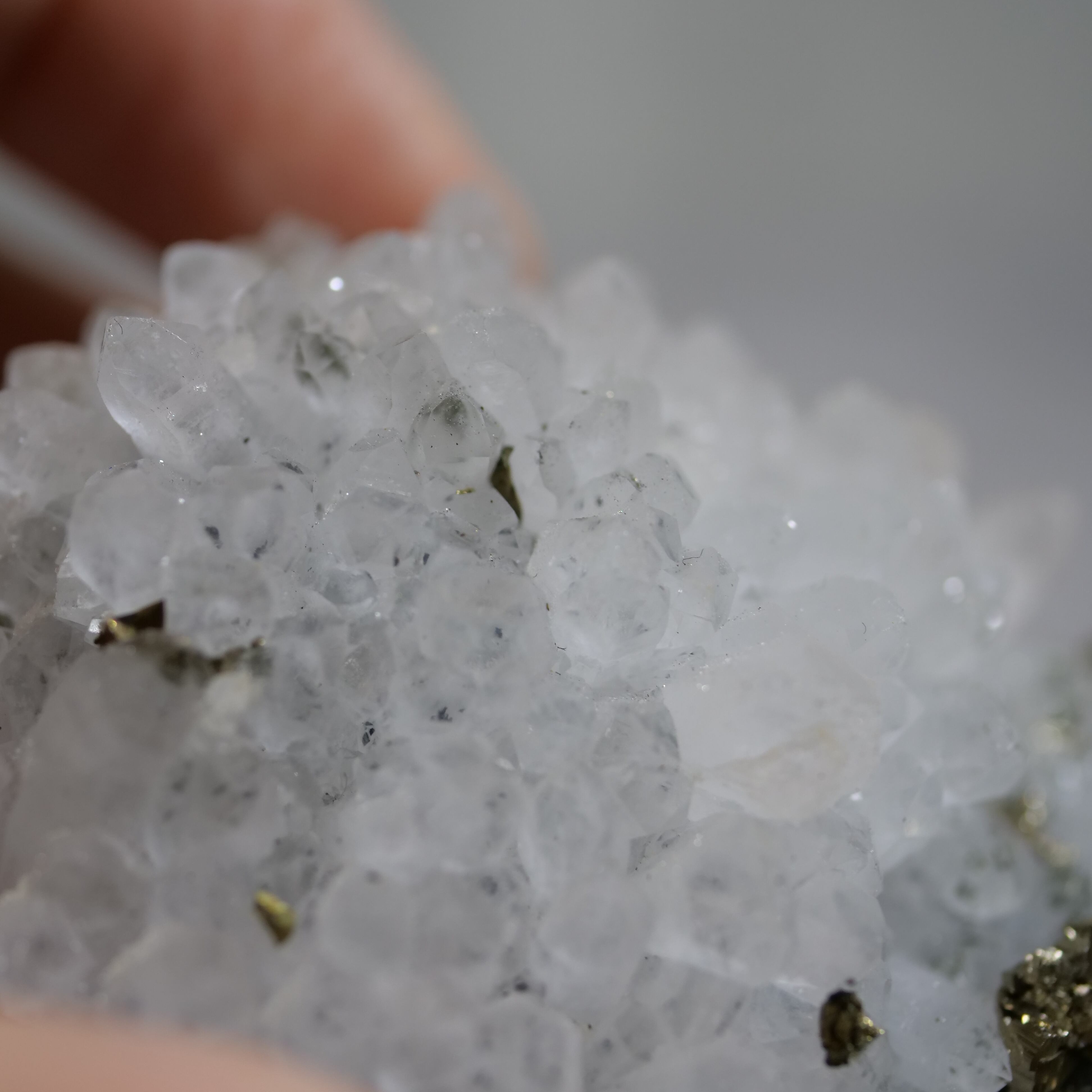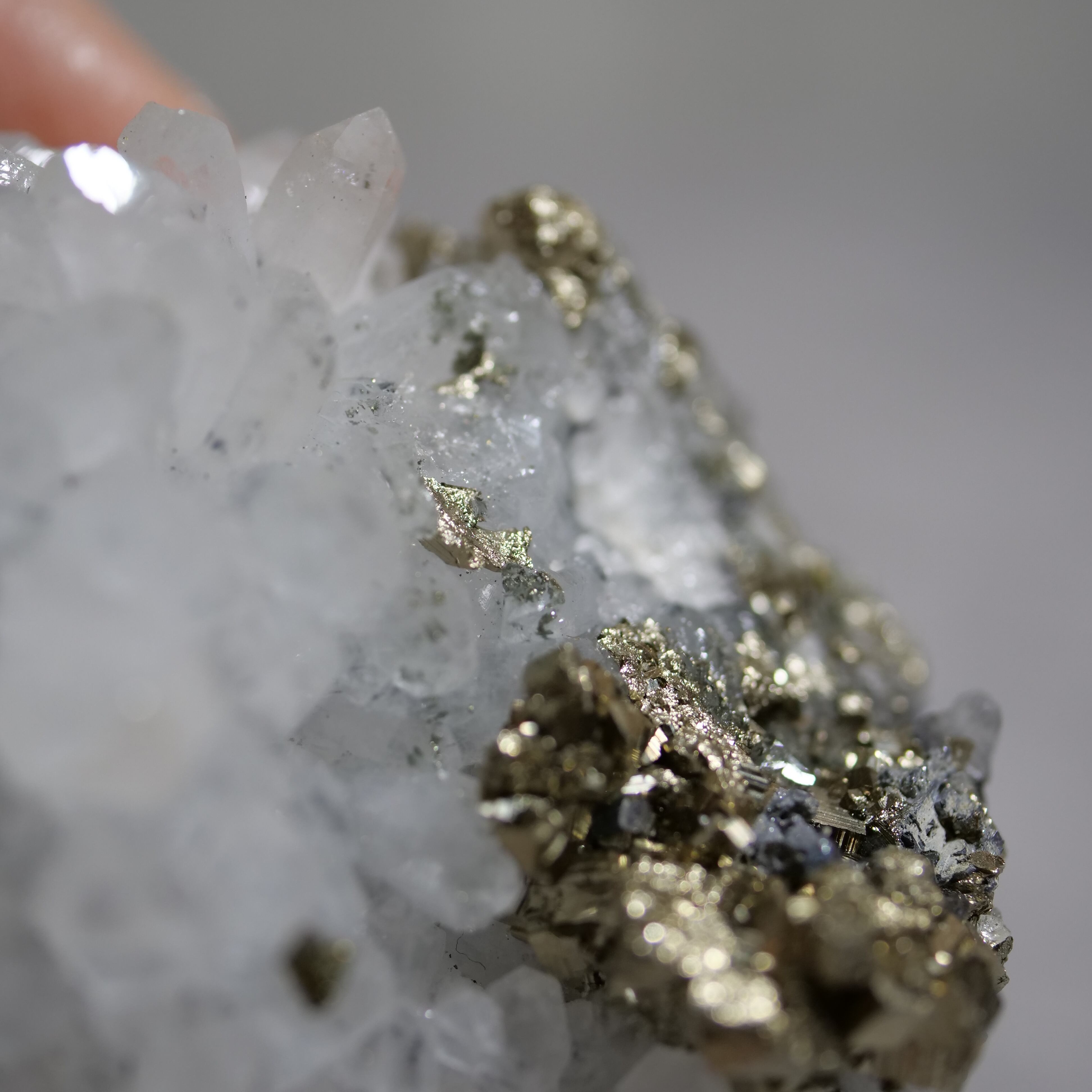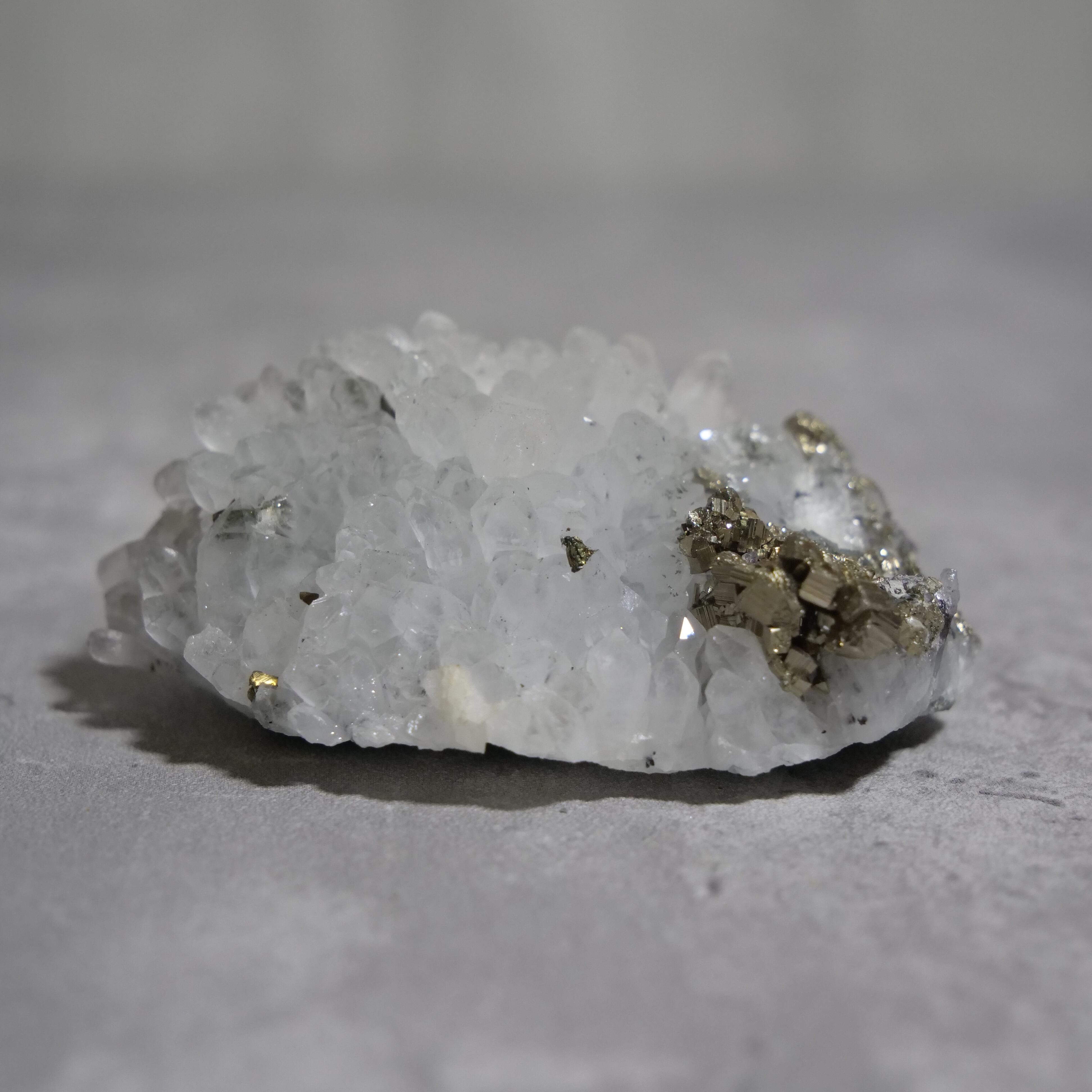 透明で輝かしい結晶の形状を持つクリアクォーツ / 水晶と、金属のメタリックな輝きを持ちどこか無骨さを感じるパイライトの共生。