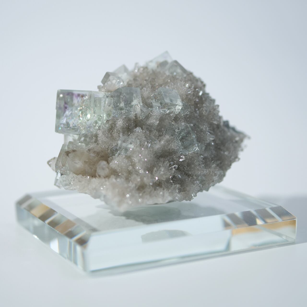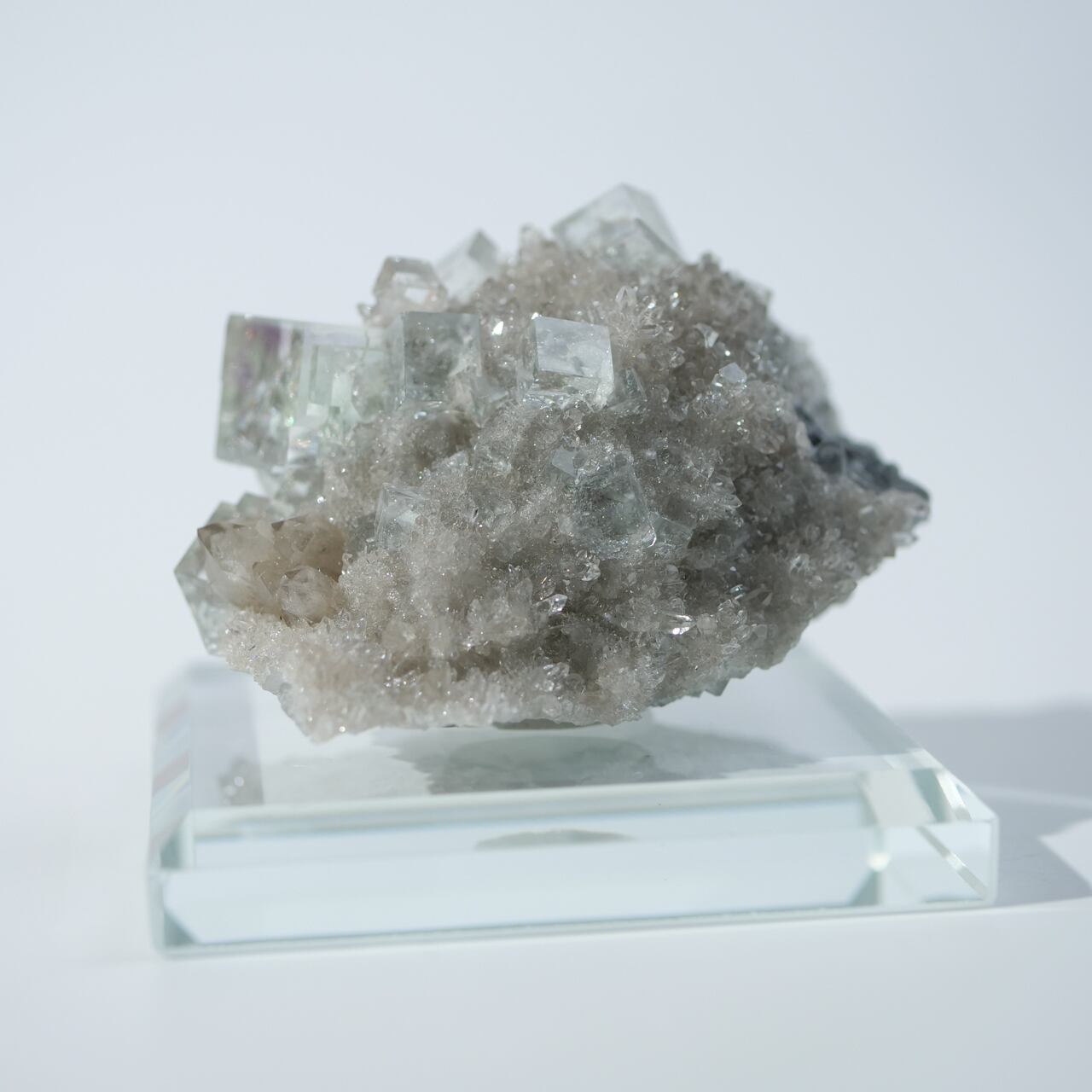 結晶の透明度、形、どちらもハイクォリティと言えるこちらのお石は、ライトグリーンのフローライトとスモーキークォーツの共生鉱物です。
