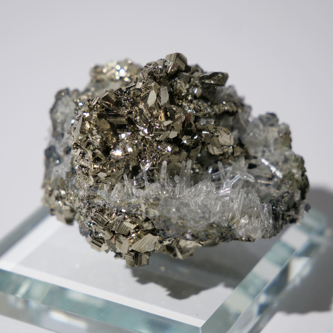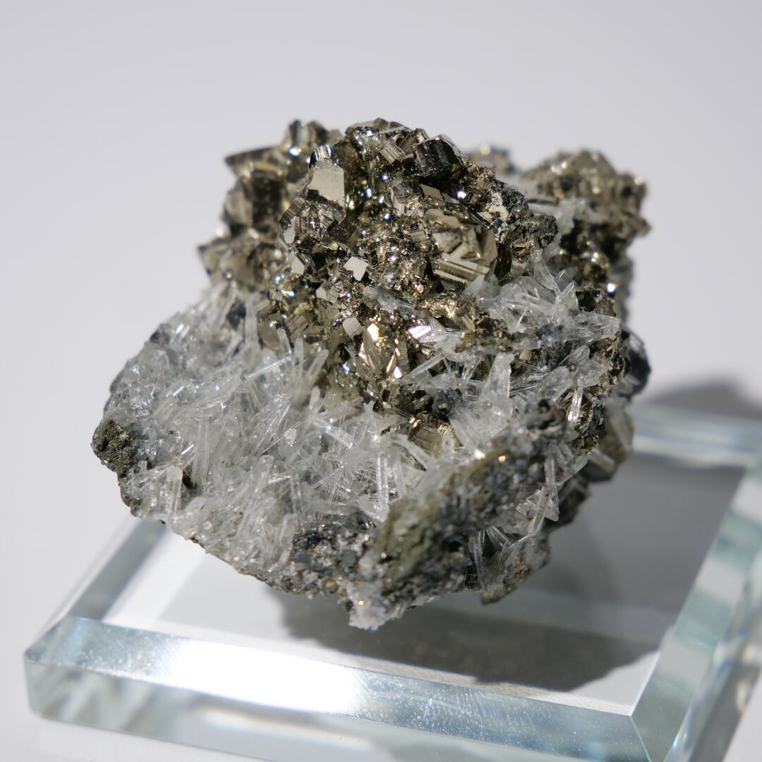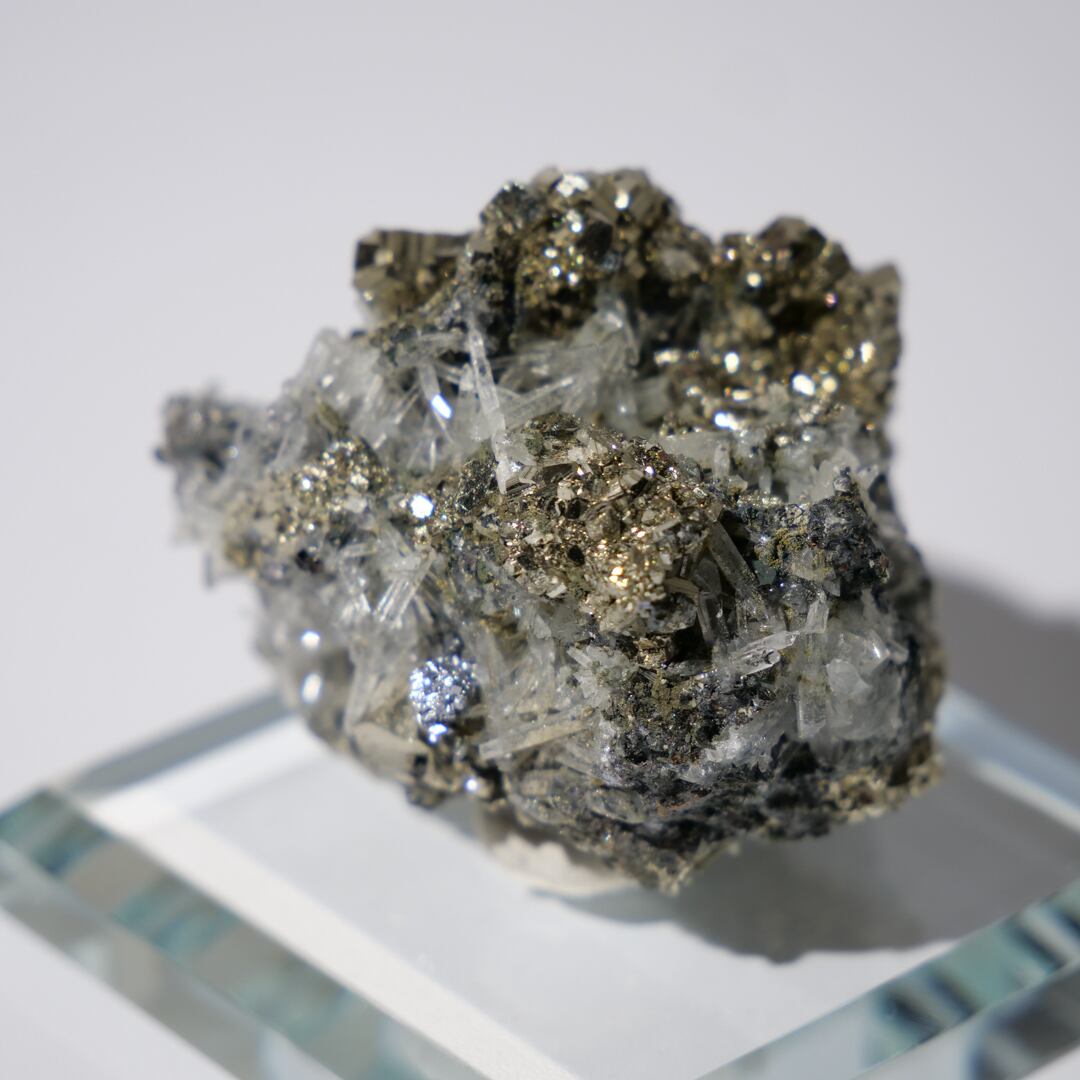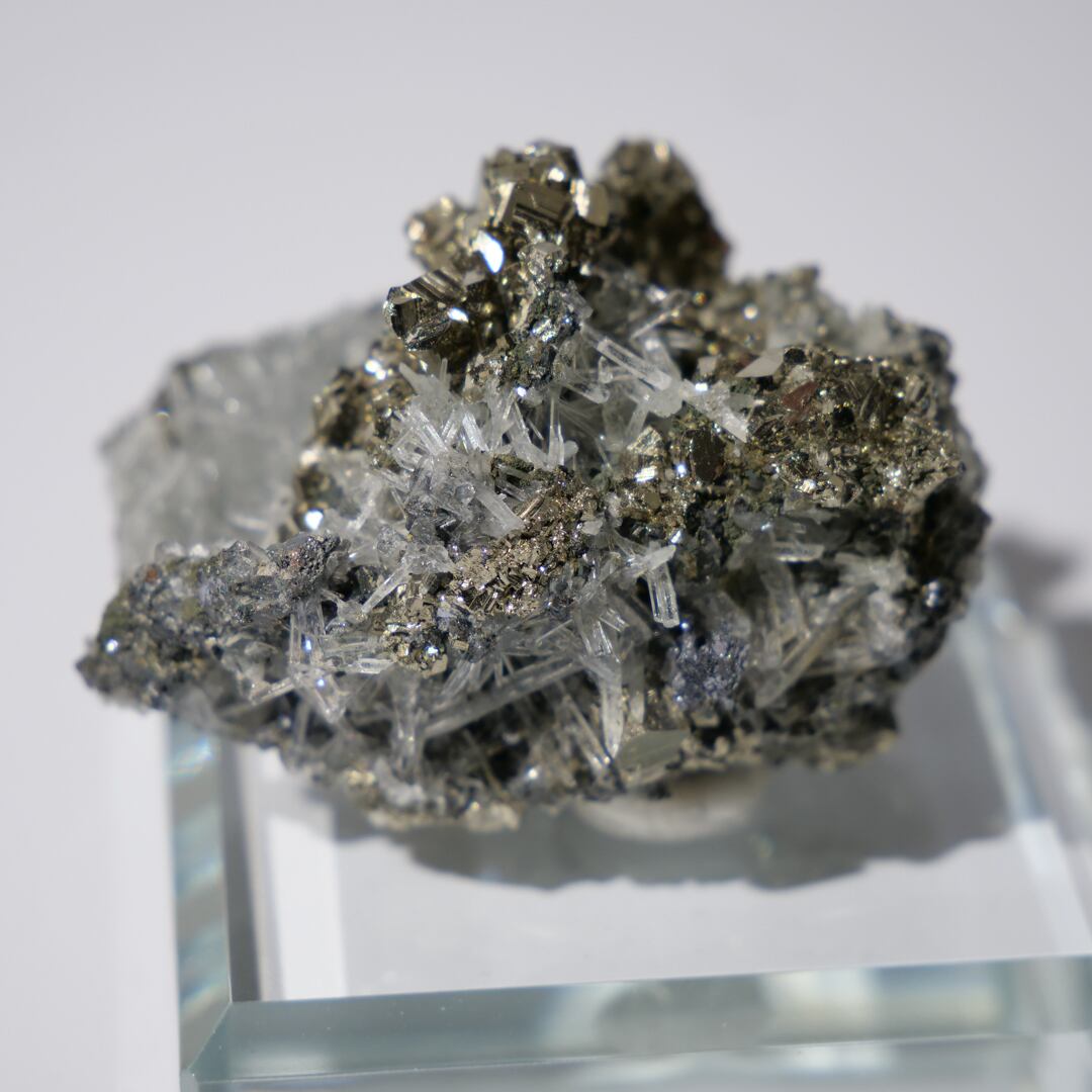 霜柱のように細いクォーツが細かなパイライトの結晶を包み込み