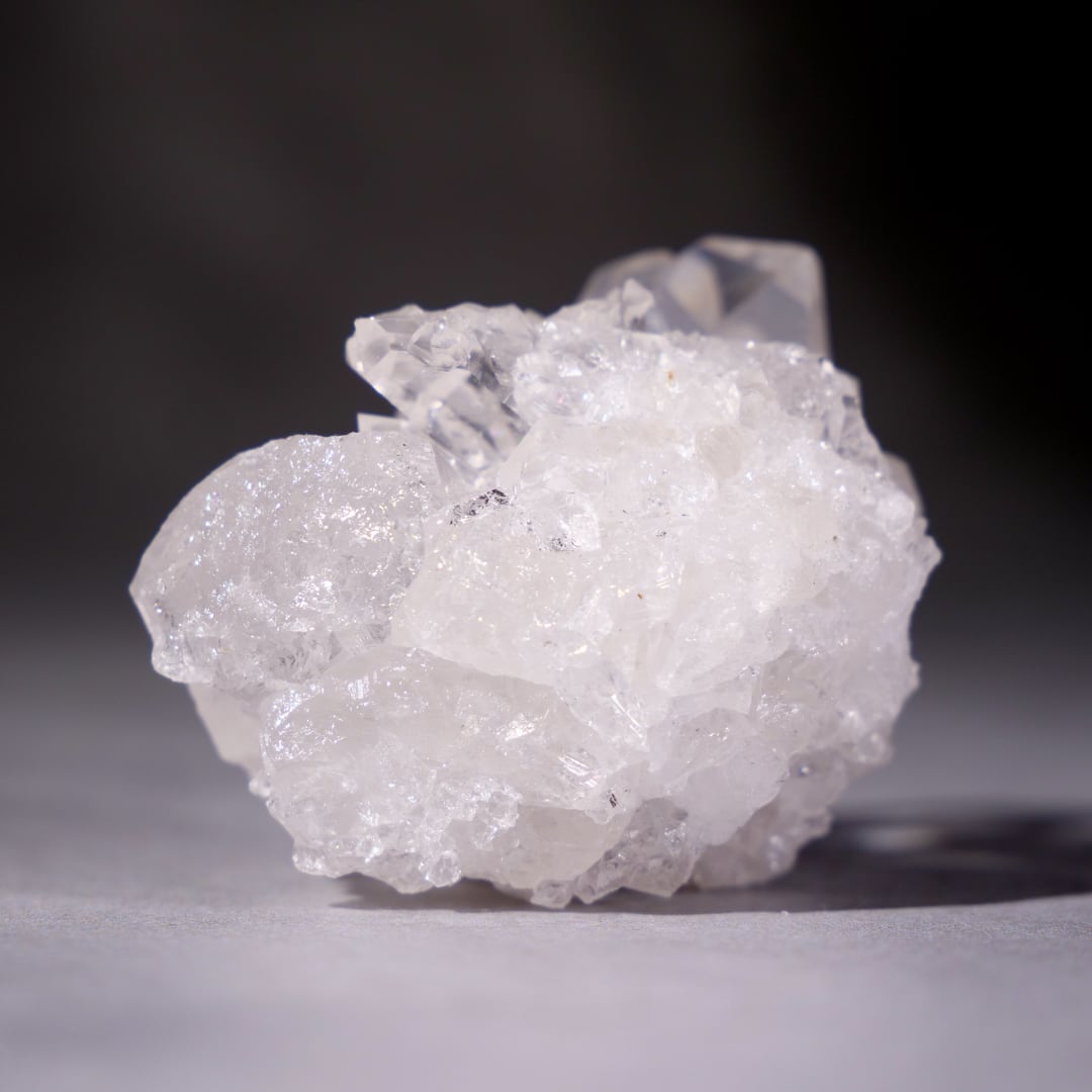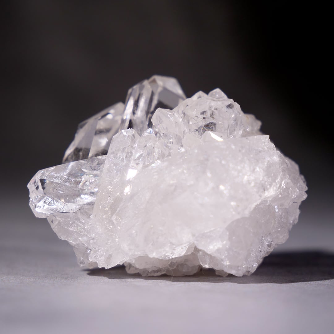 透き通る氷のような透明度と眩い輝きをもつトマスゴンサガ産水晶クラスター。