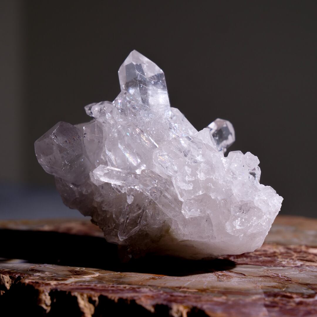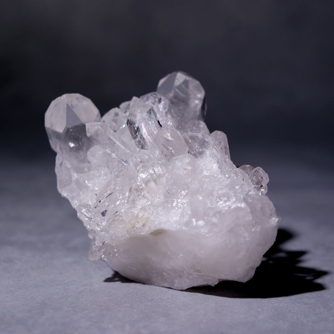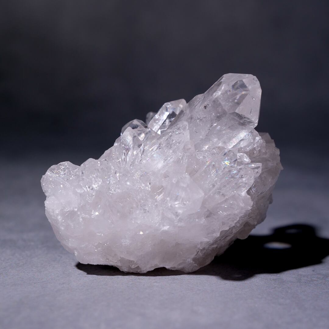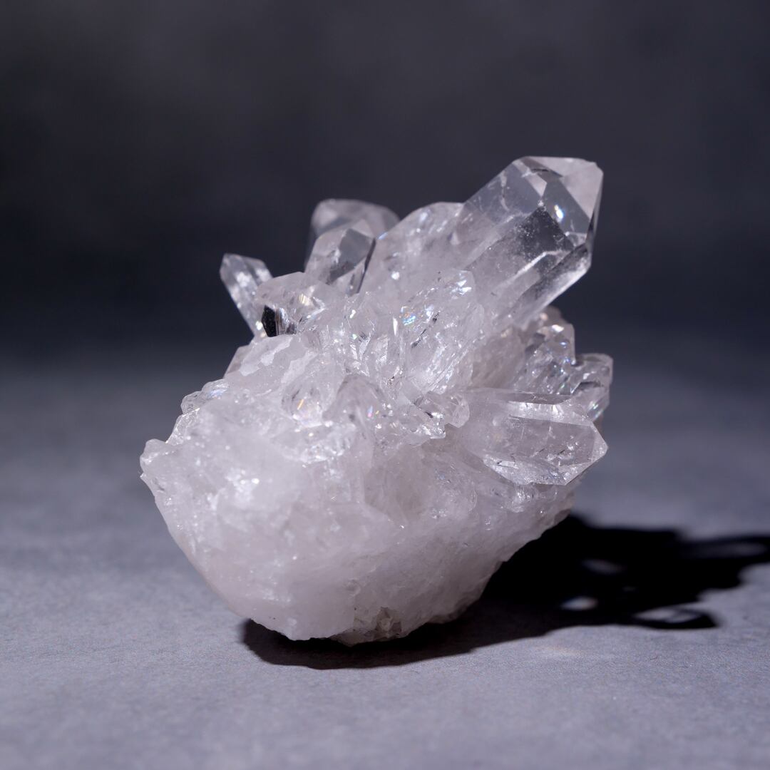 透き通る氷のような透明度と眩い輝きをもつトマスゴンサガ産水晶クラスター。