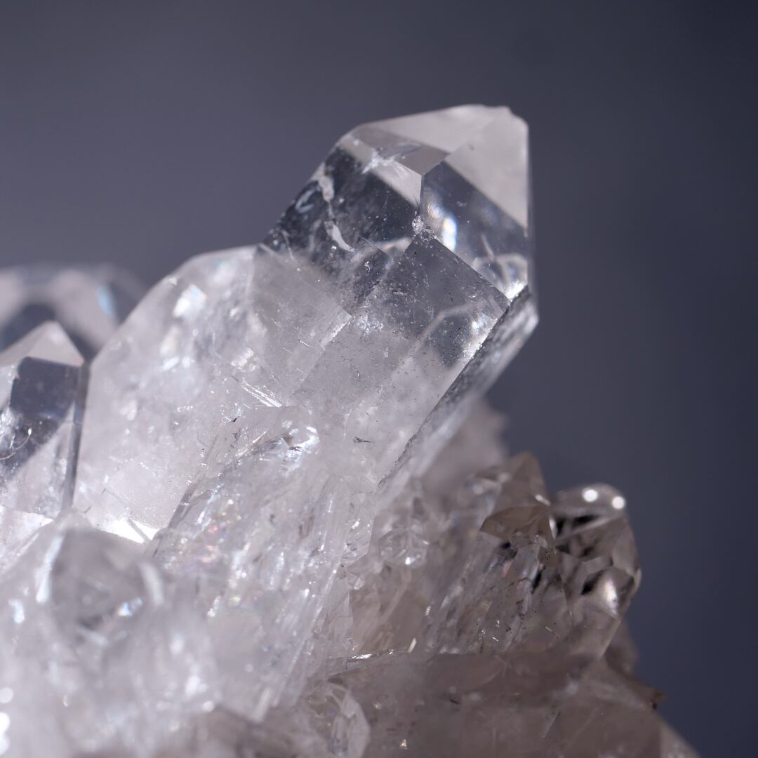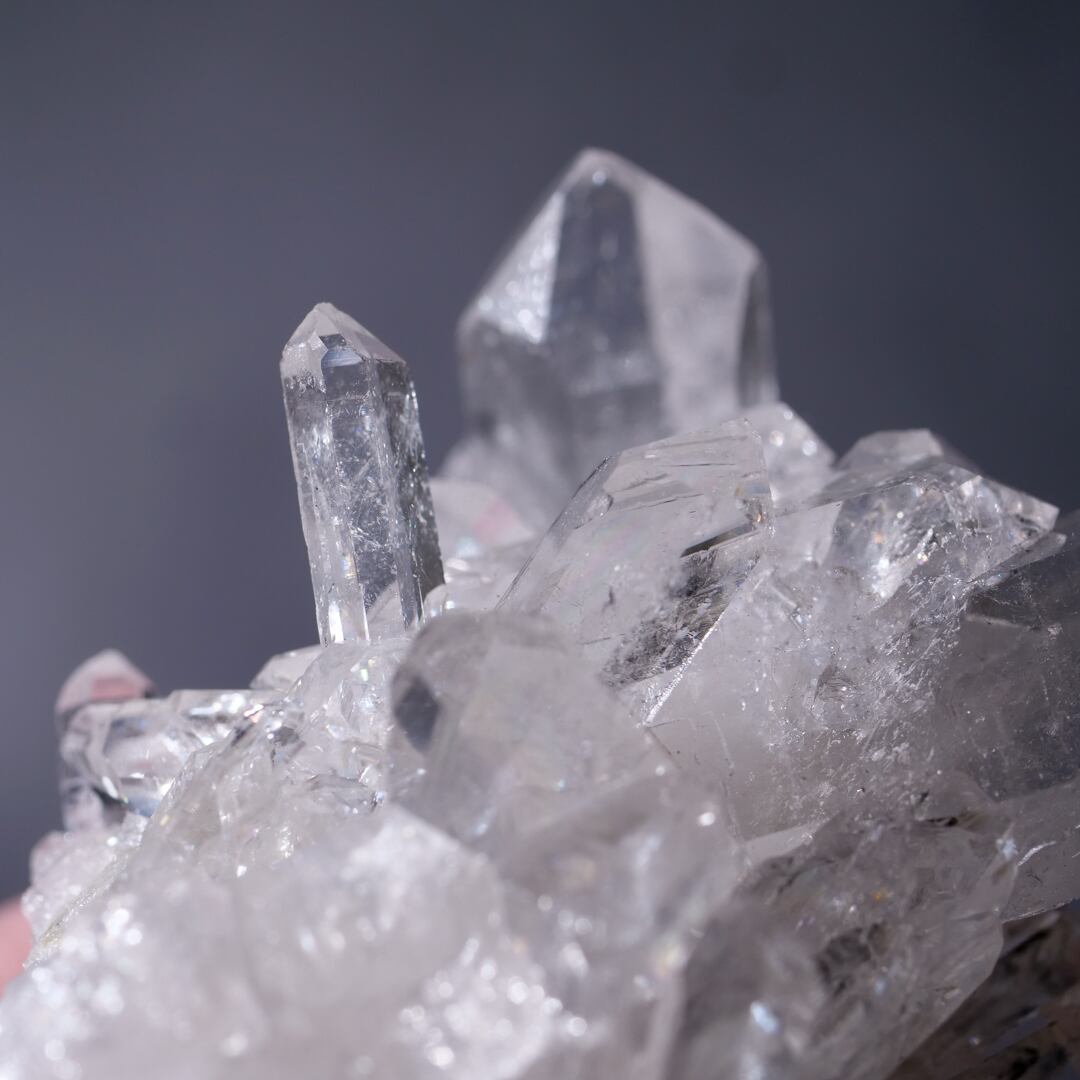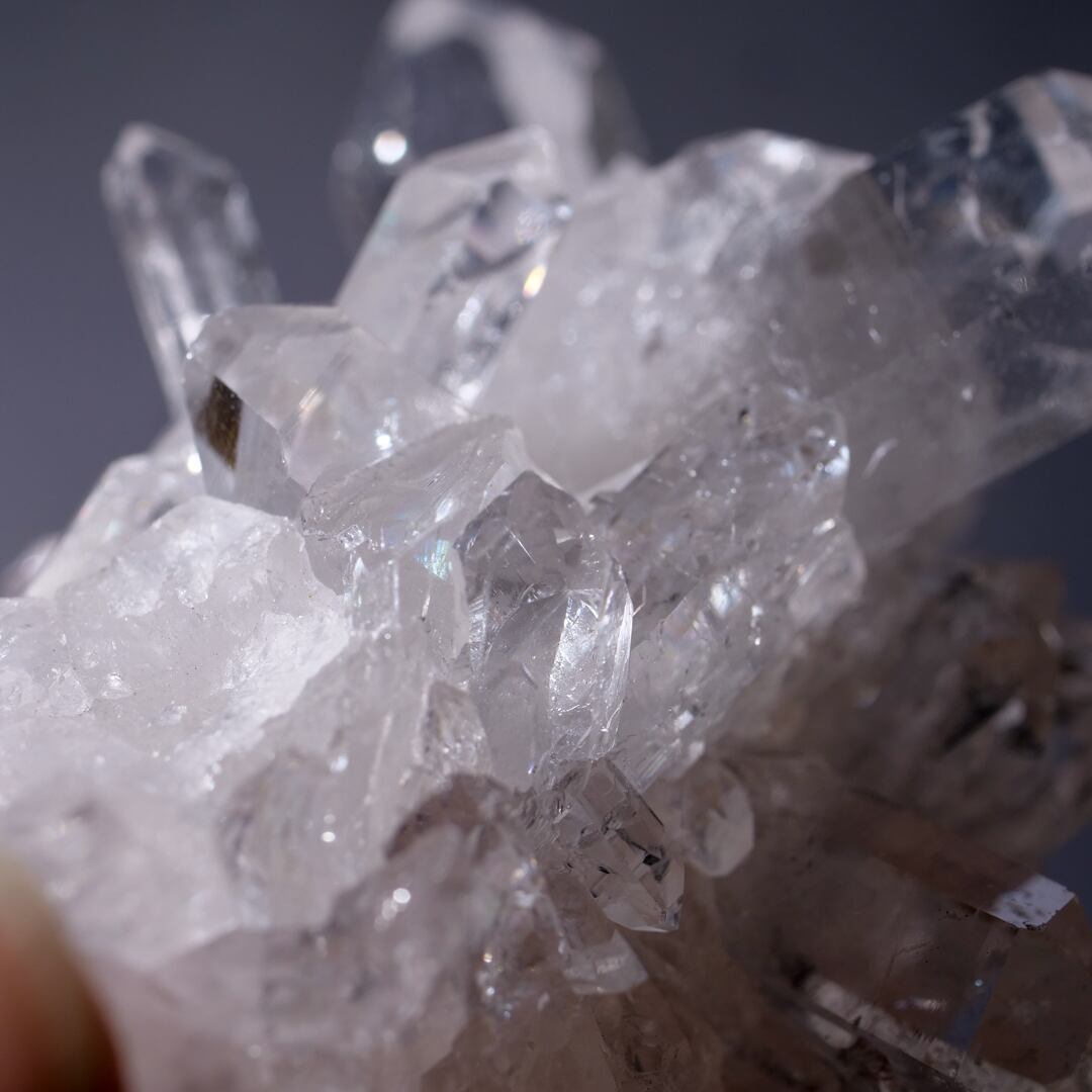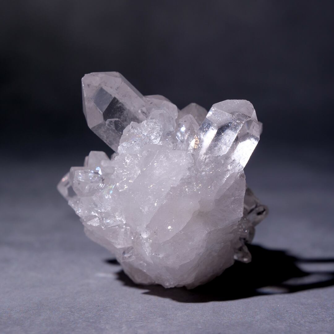 透き通る氷のような透明度と眩い輝きをもつトマスゴンサガ産水晶クラスター。