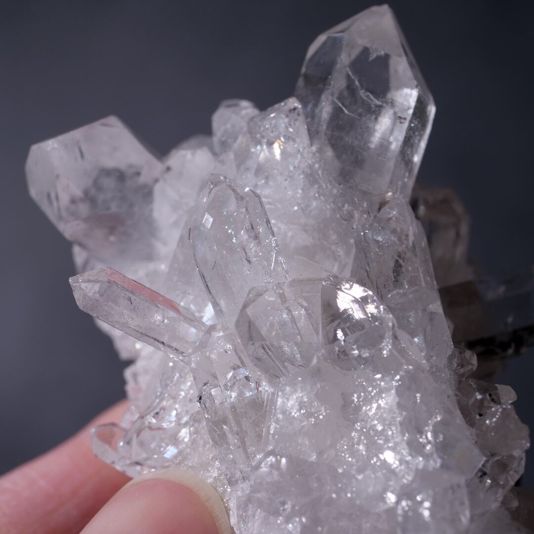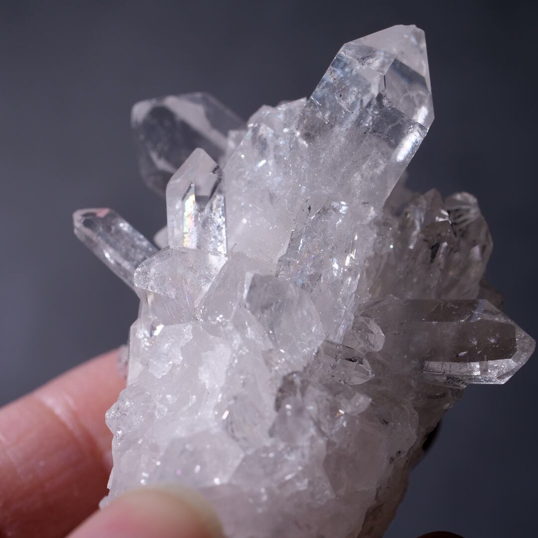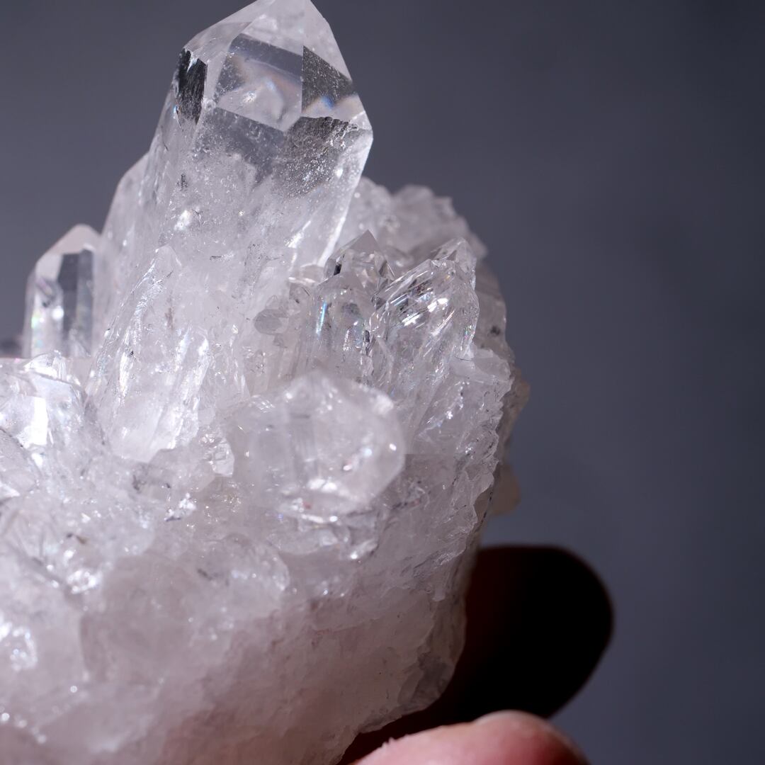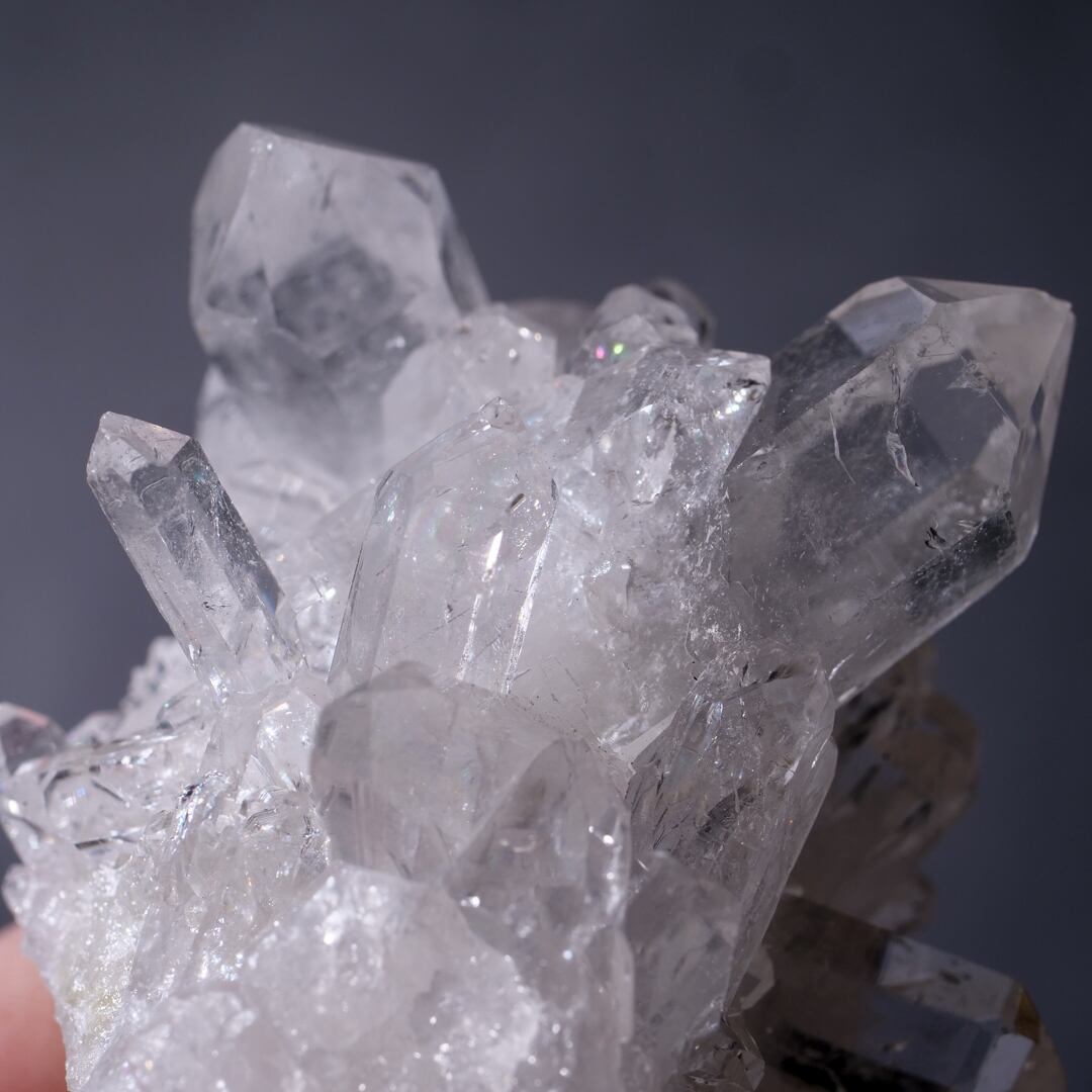 透き通る氷のような透明度と眩い輝きをもつトマスゴンサガ産水晶クラスター。