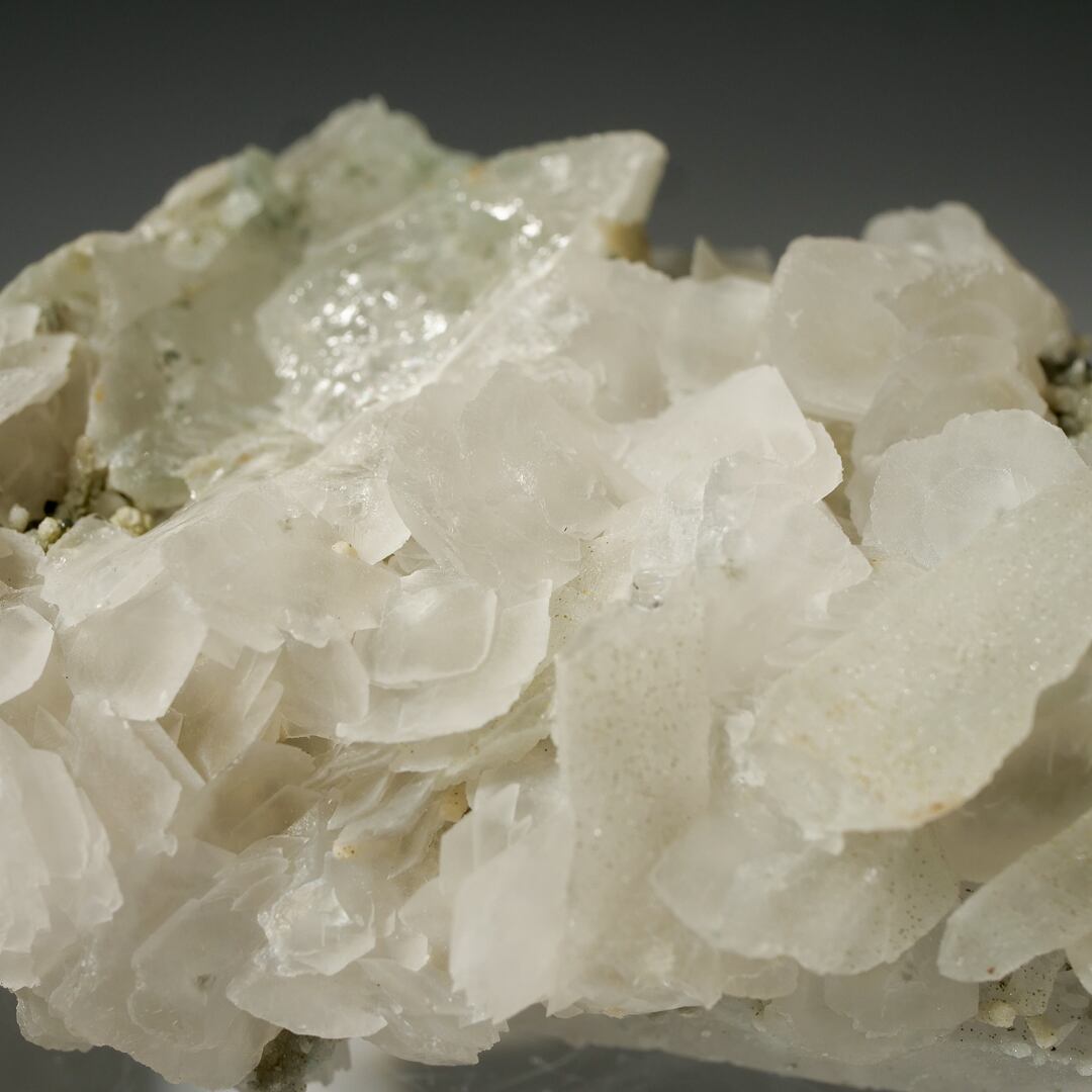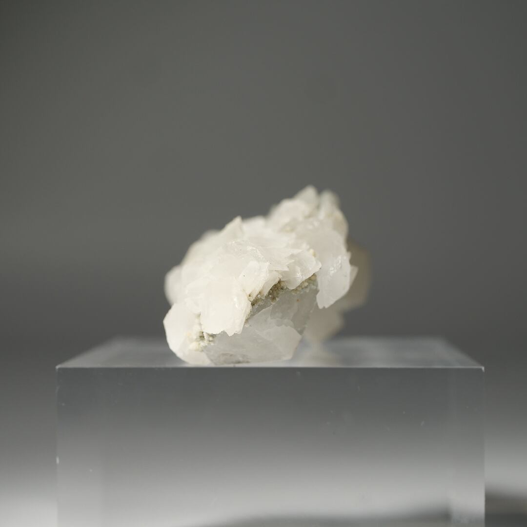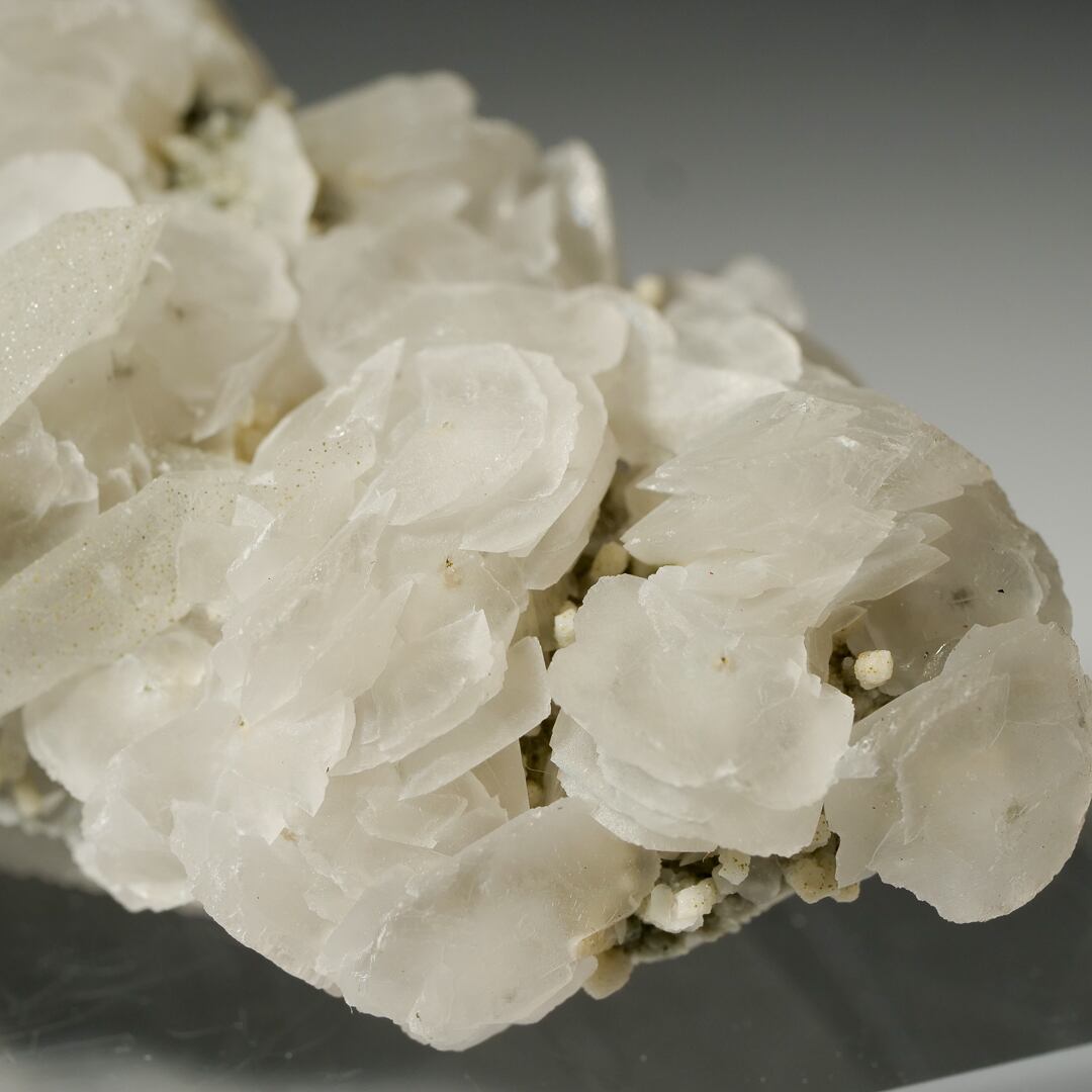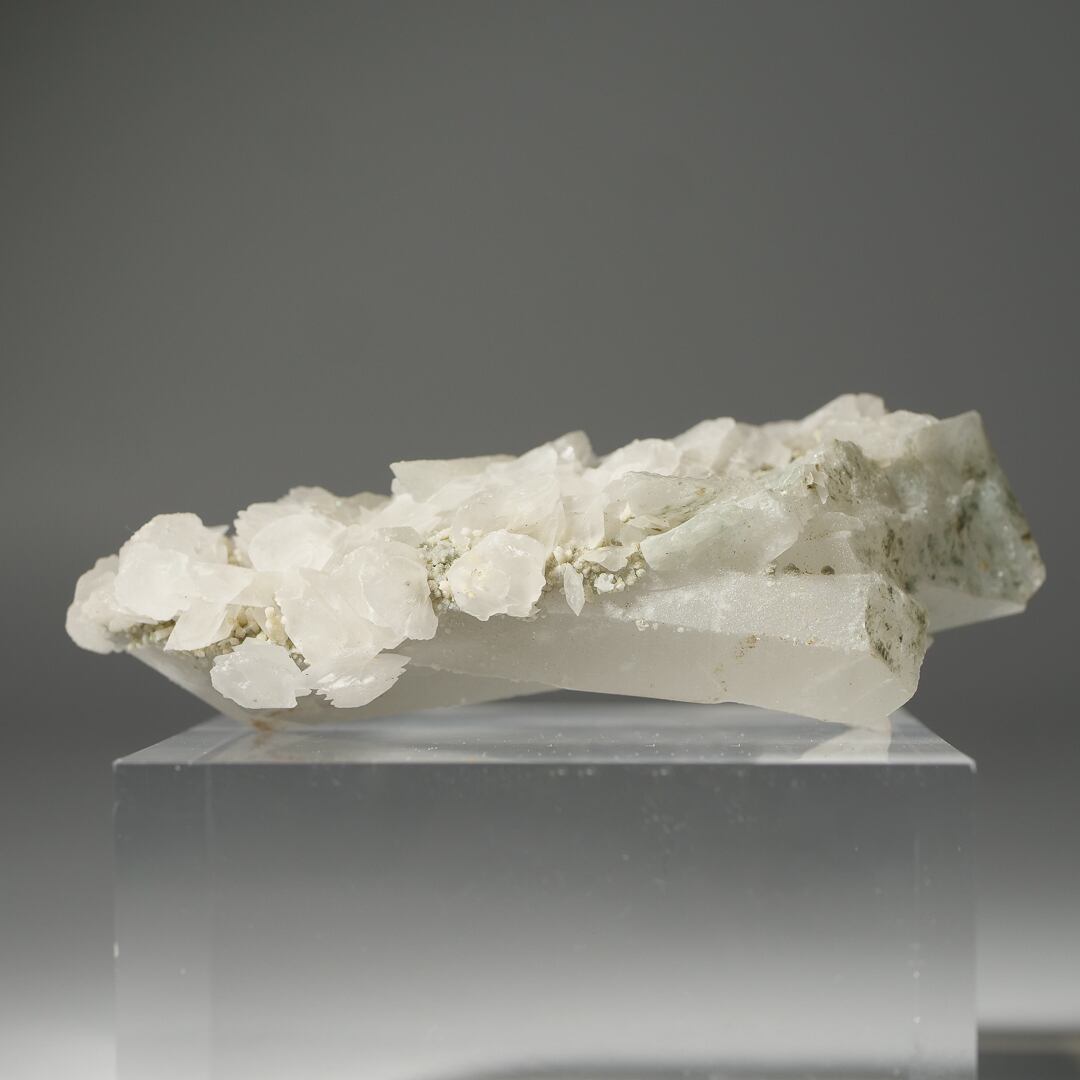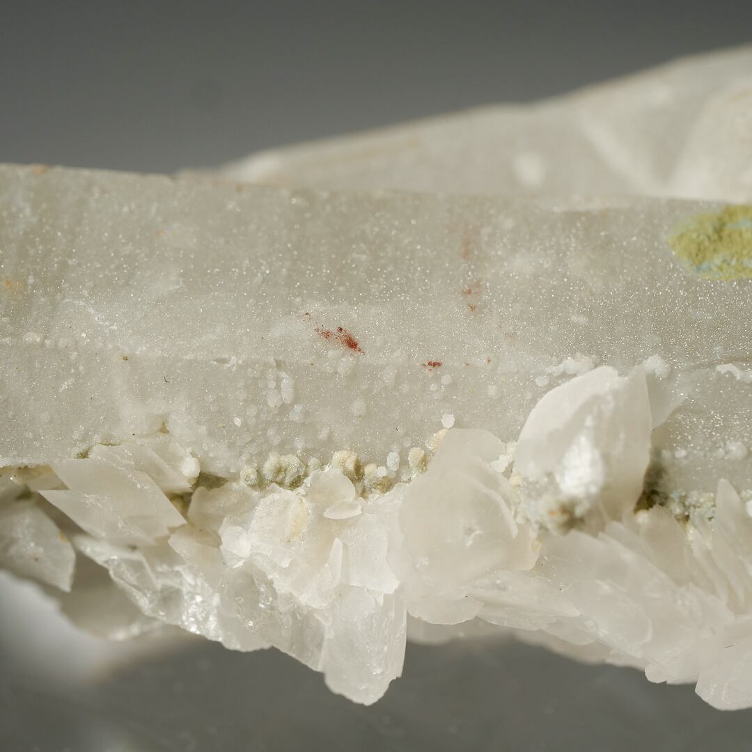 粉砂糖を纏ったようなクォーツの上に、カルサイトの小花が華やかに咲き誇っています。