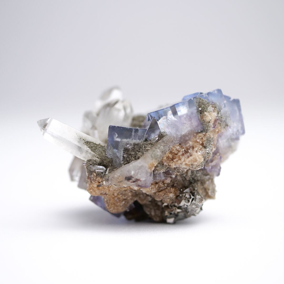 フローライトと水晶、そしてパイライトが作り出した美しい共生鉱物。
