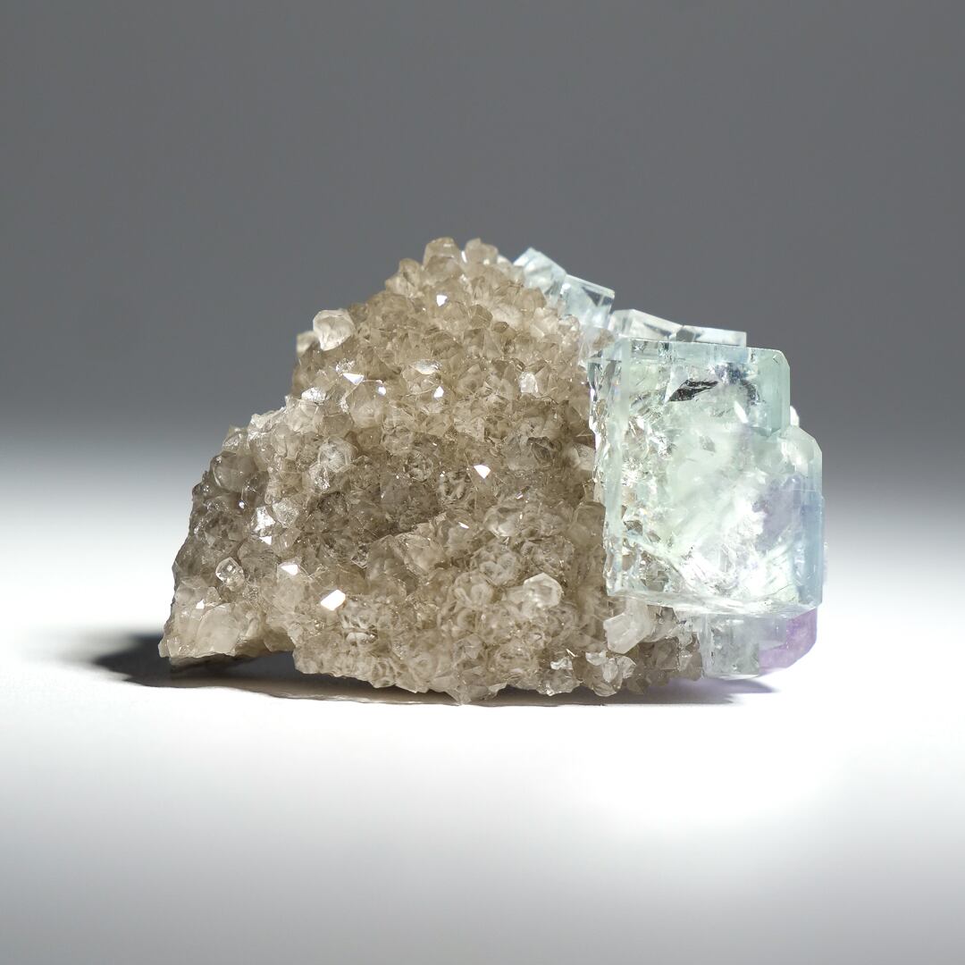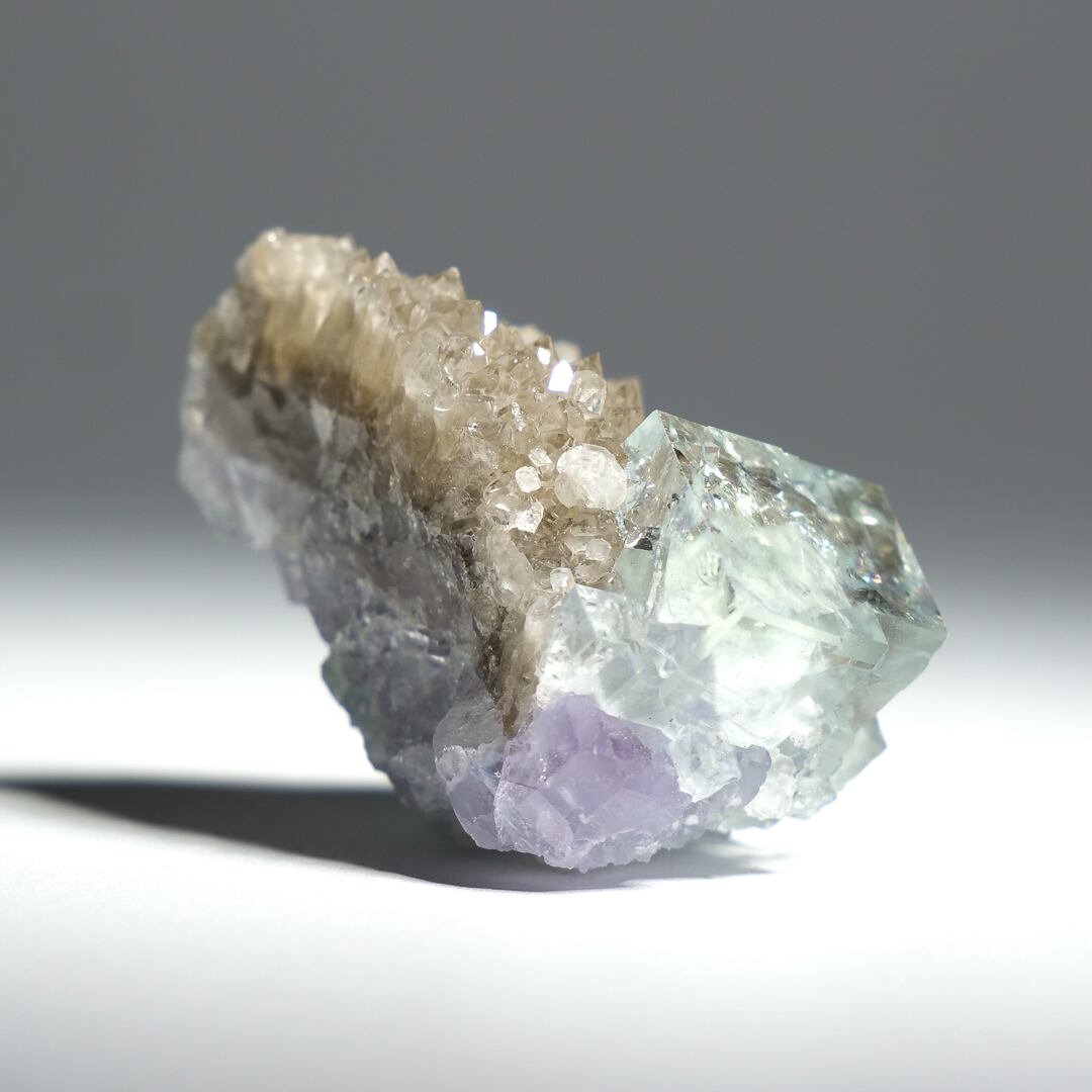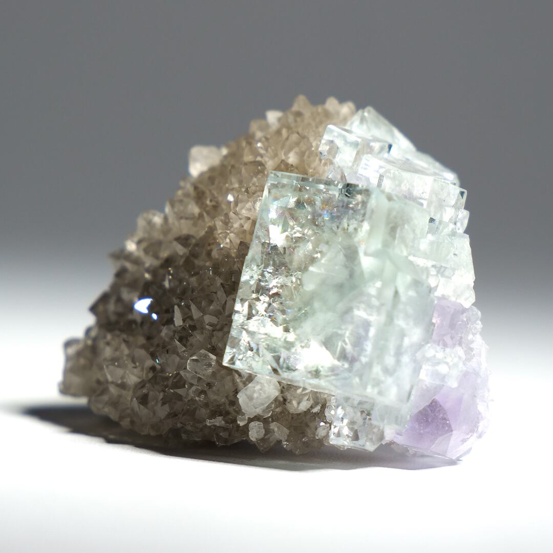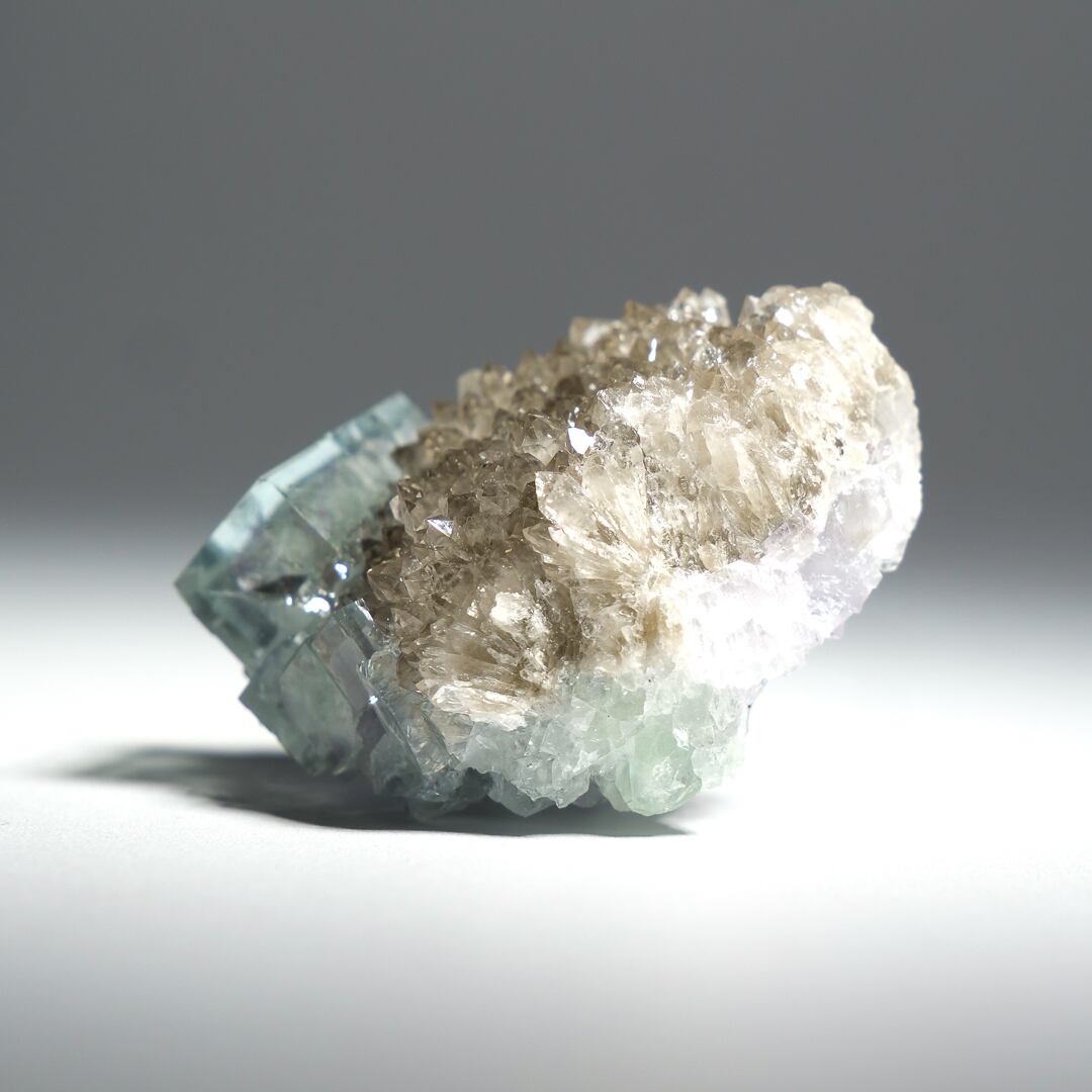 透明度が高いライトグリーンのフローライトと、スモーキークォーツの共生鉱物。