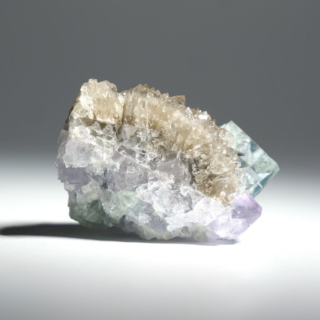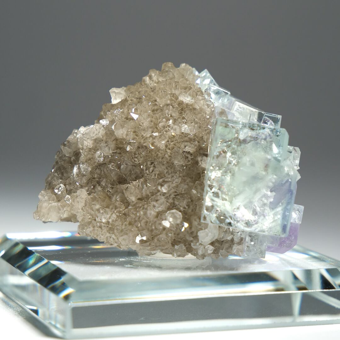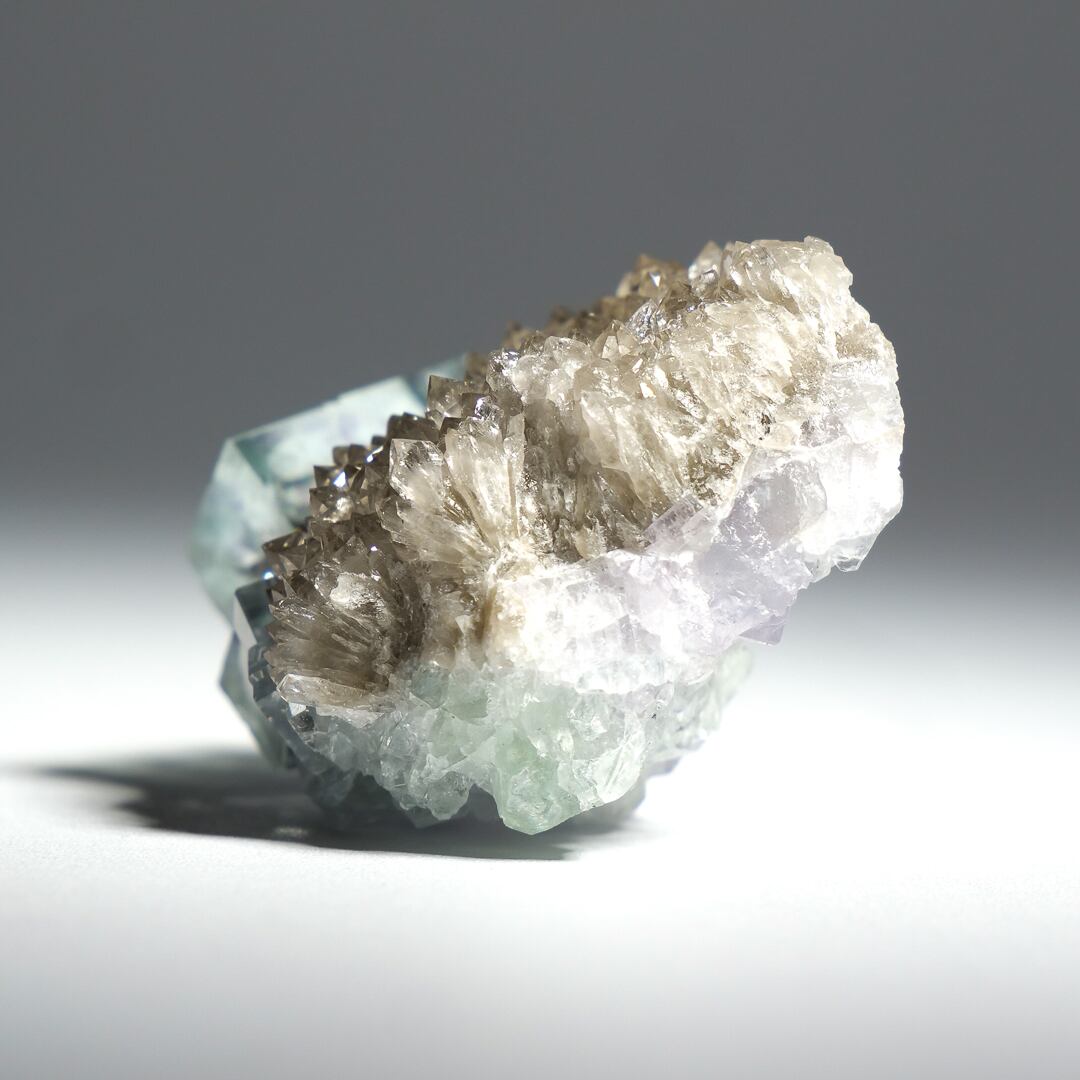 透明度が高いライトグリーンのフローライトと、スモーキークォーツの共生鉱物。