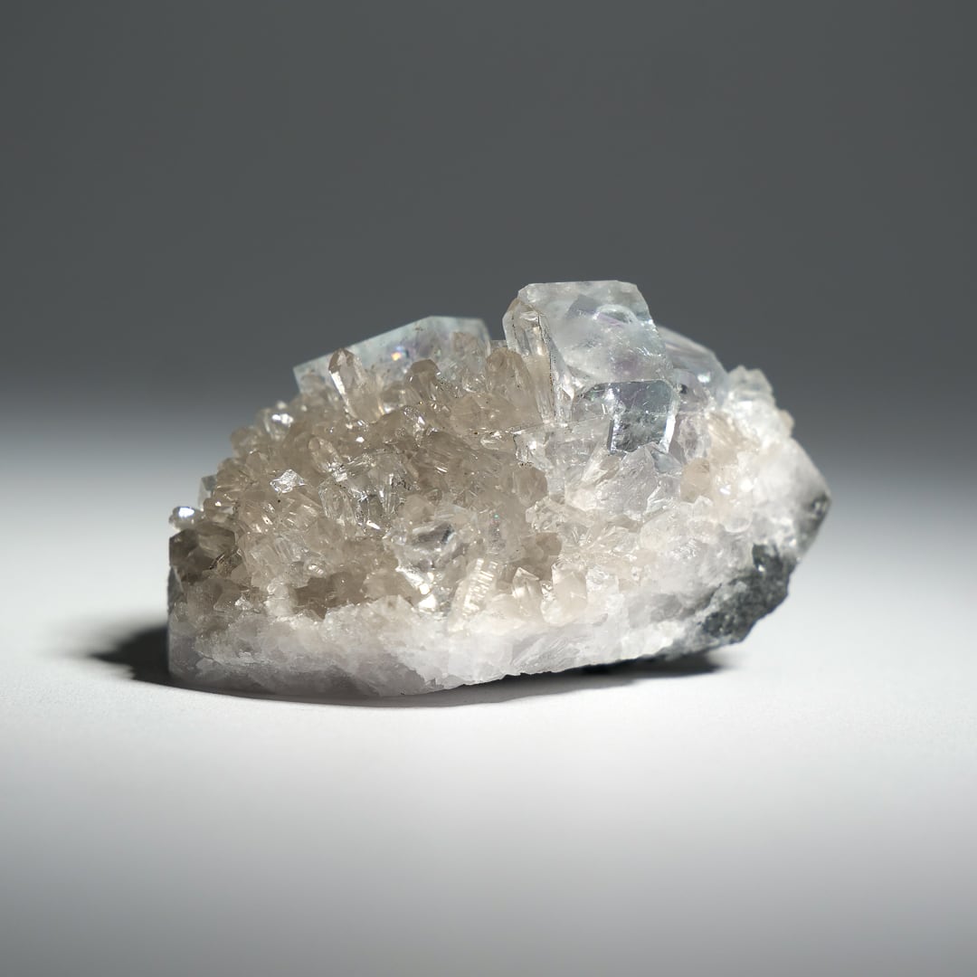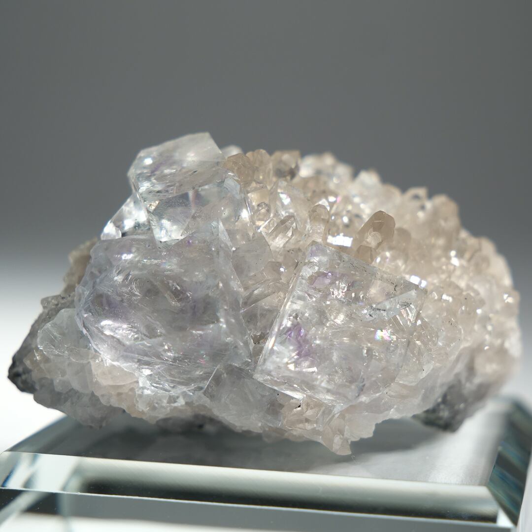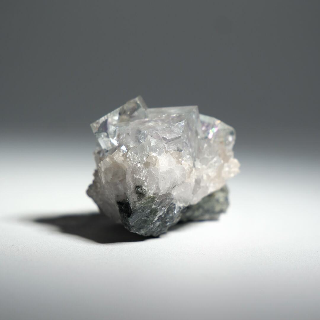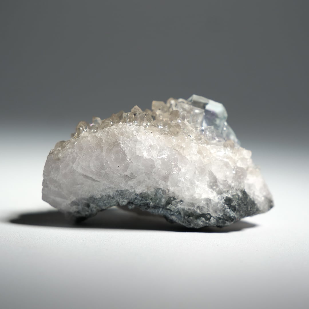 ブルーグリーンのフローライトと、小さなスモーキークォーツの共生鉱物。
