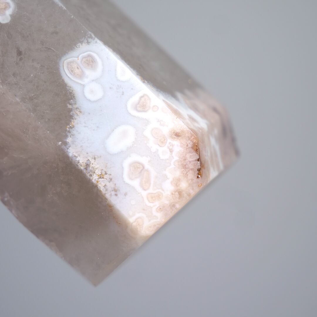 ほんのり緑がかったクォーツの中に、可愛らしいアゲートの花が咲いています。