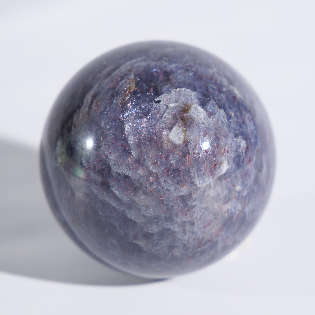 赤い斑点のような模様が見えるものは「ブラッドショット・アイオライト」と、多くの名前がある天然石です。(赤く輝く結晶はレピドクロサイトなどの鉄分と言われています)