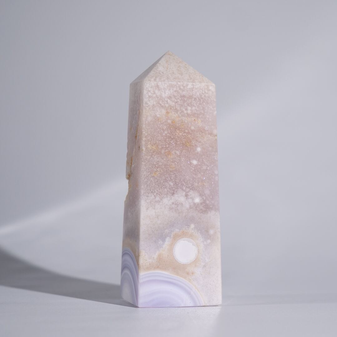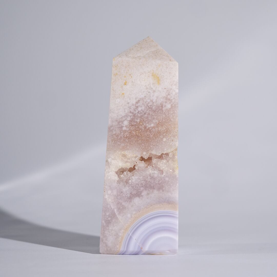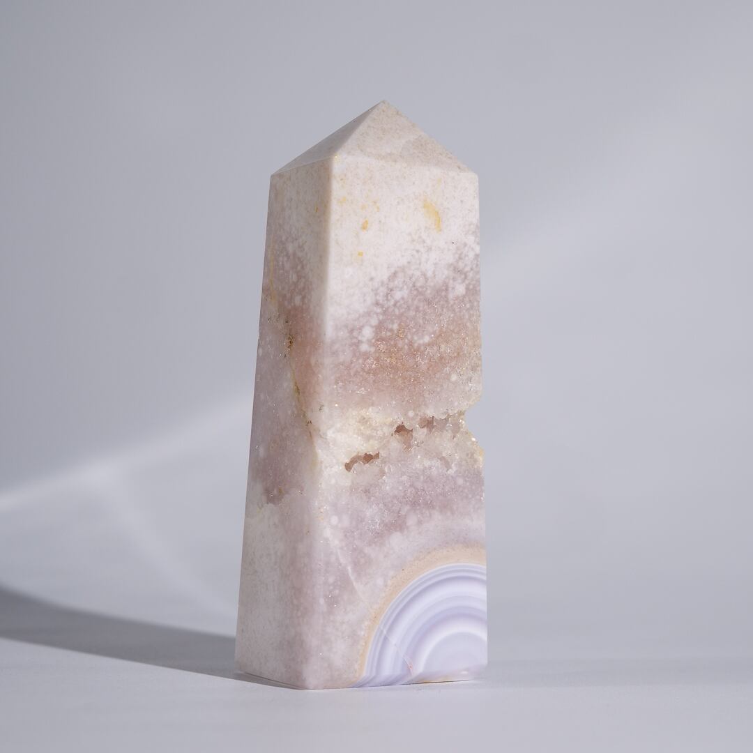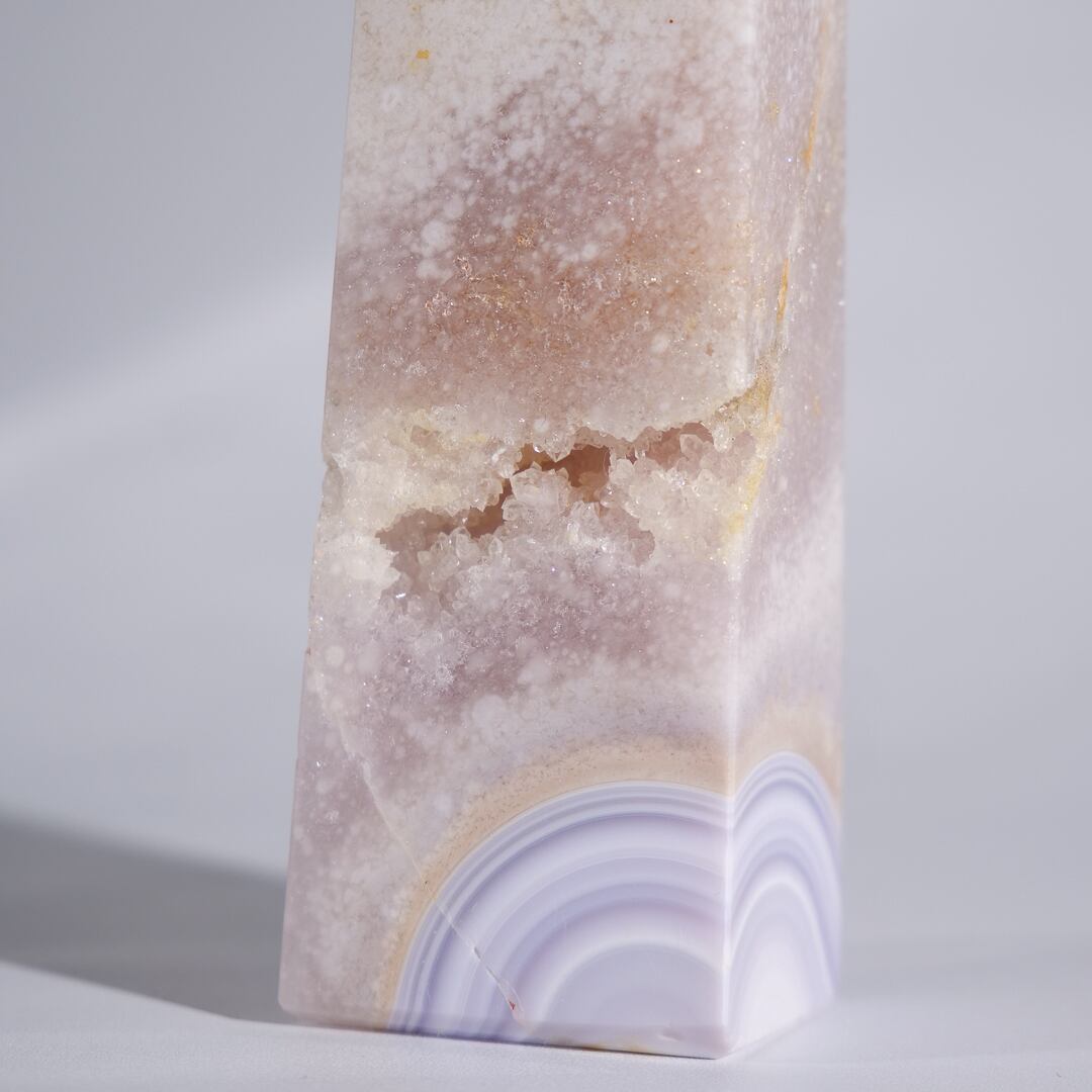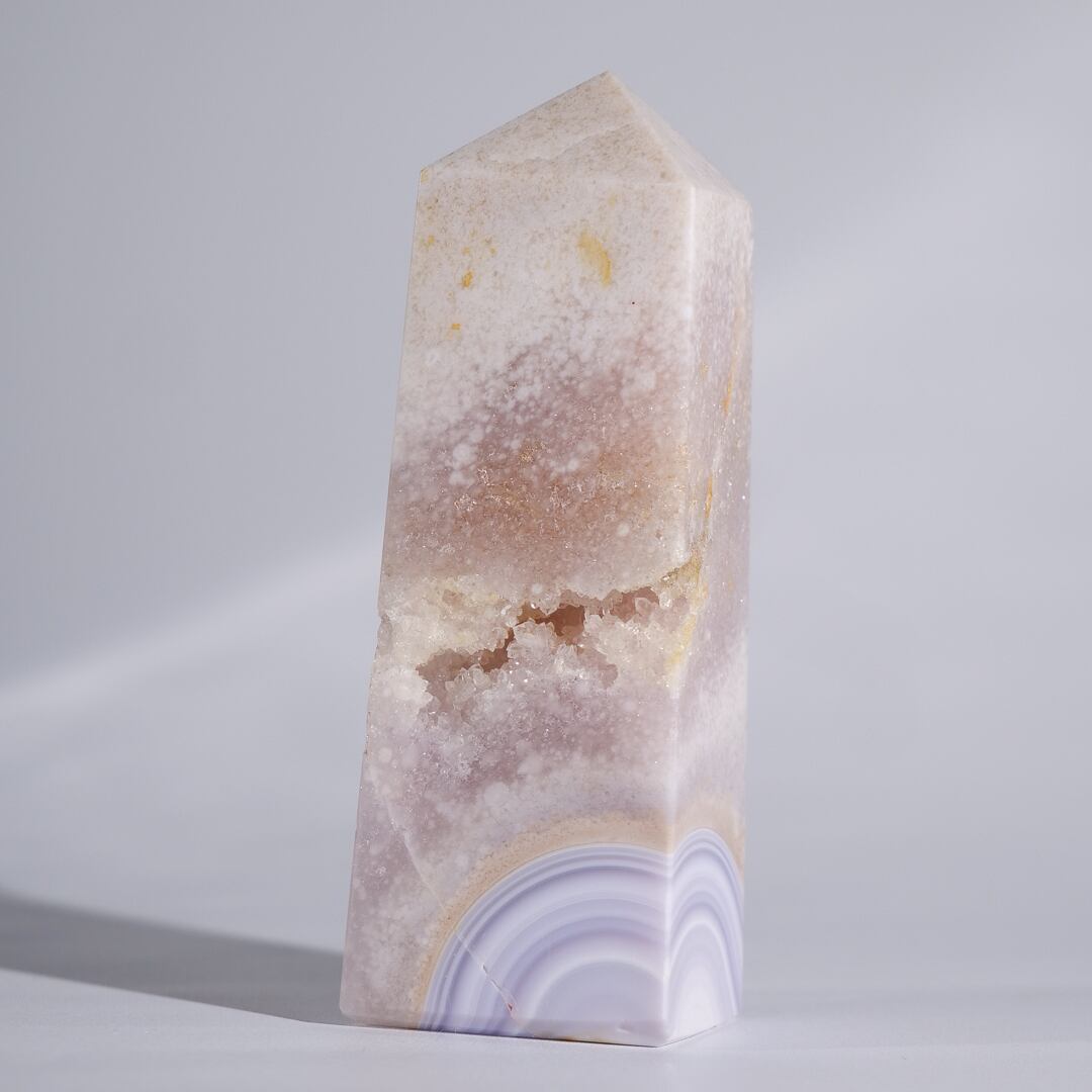 淡いピンクカラーのアメシストに、ブルーレースアゲートの虹がかかる美しいタワー。
