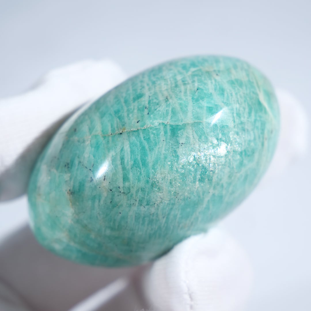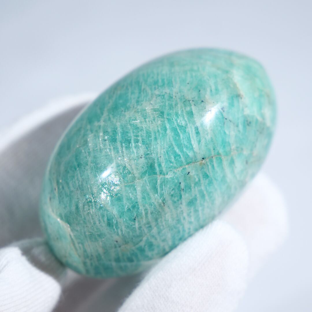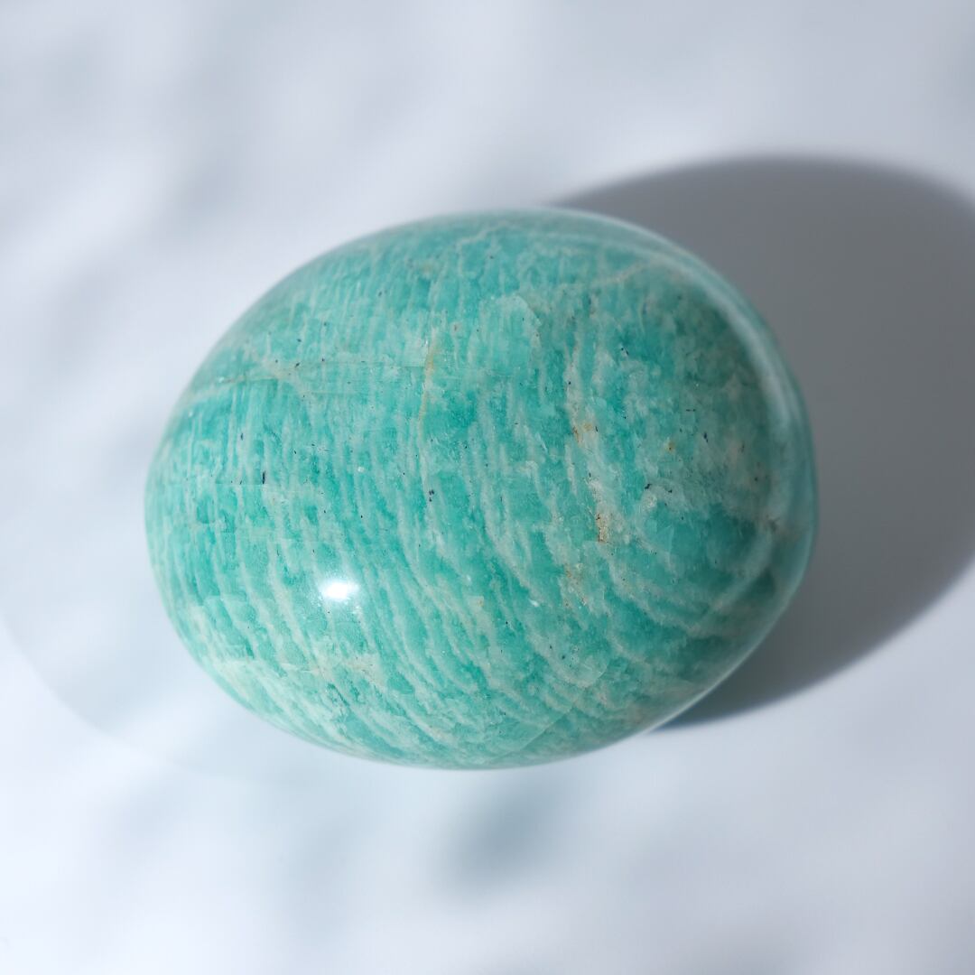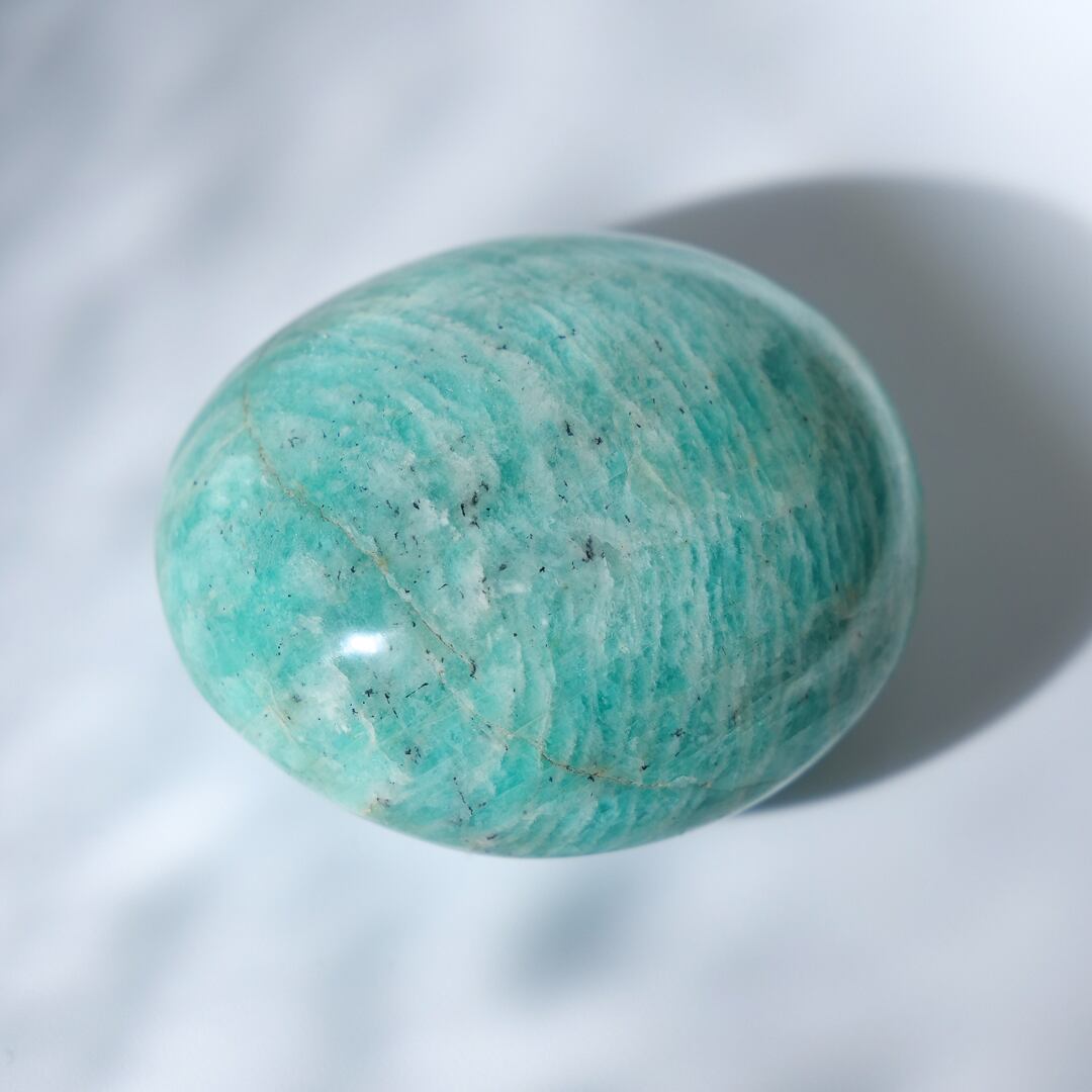 鮮やかな青緑色と白色の模様が美しい、アマゾナイト。