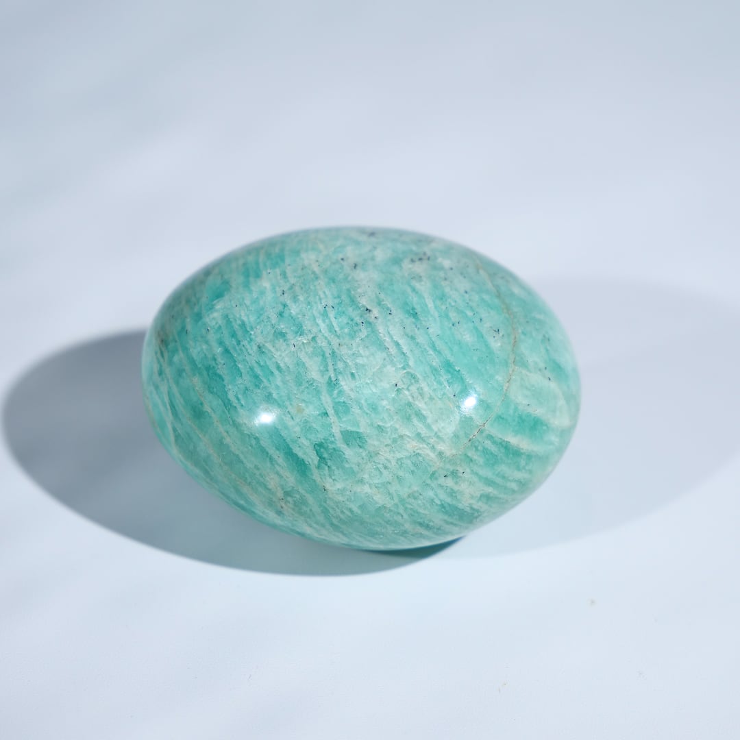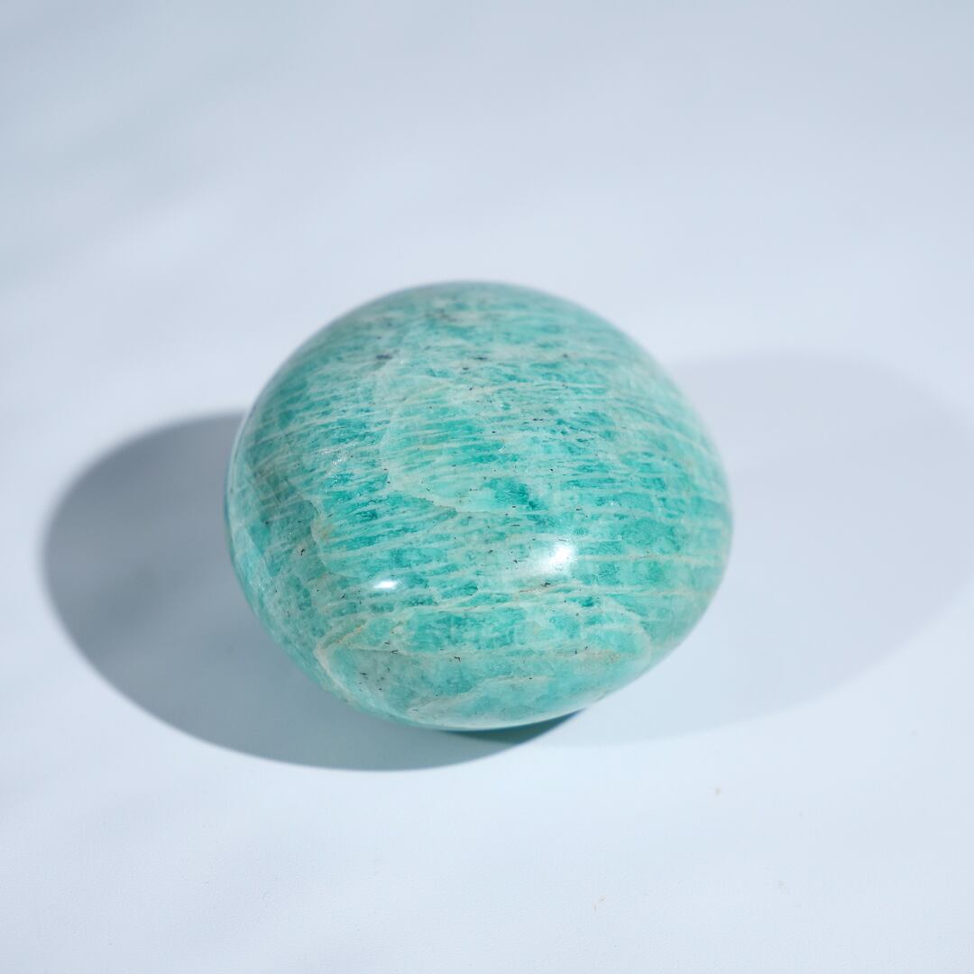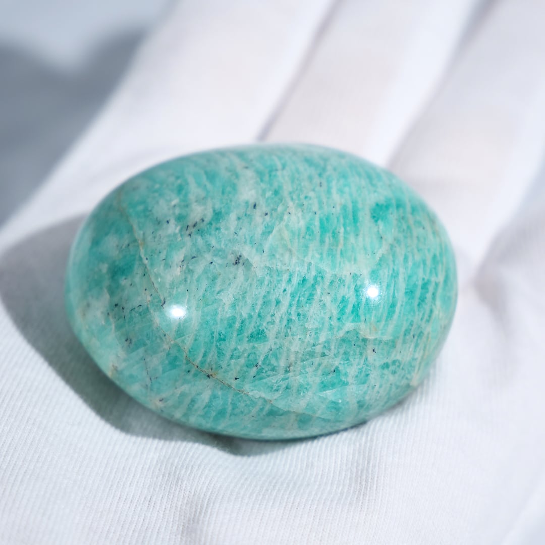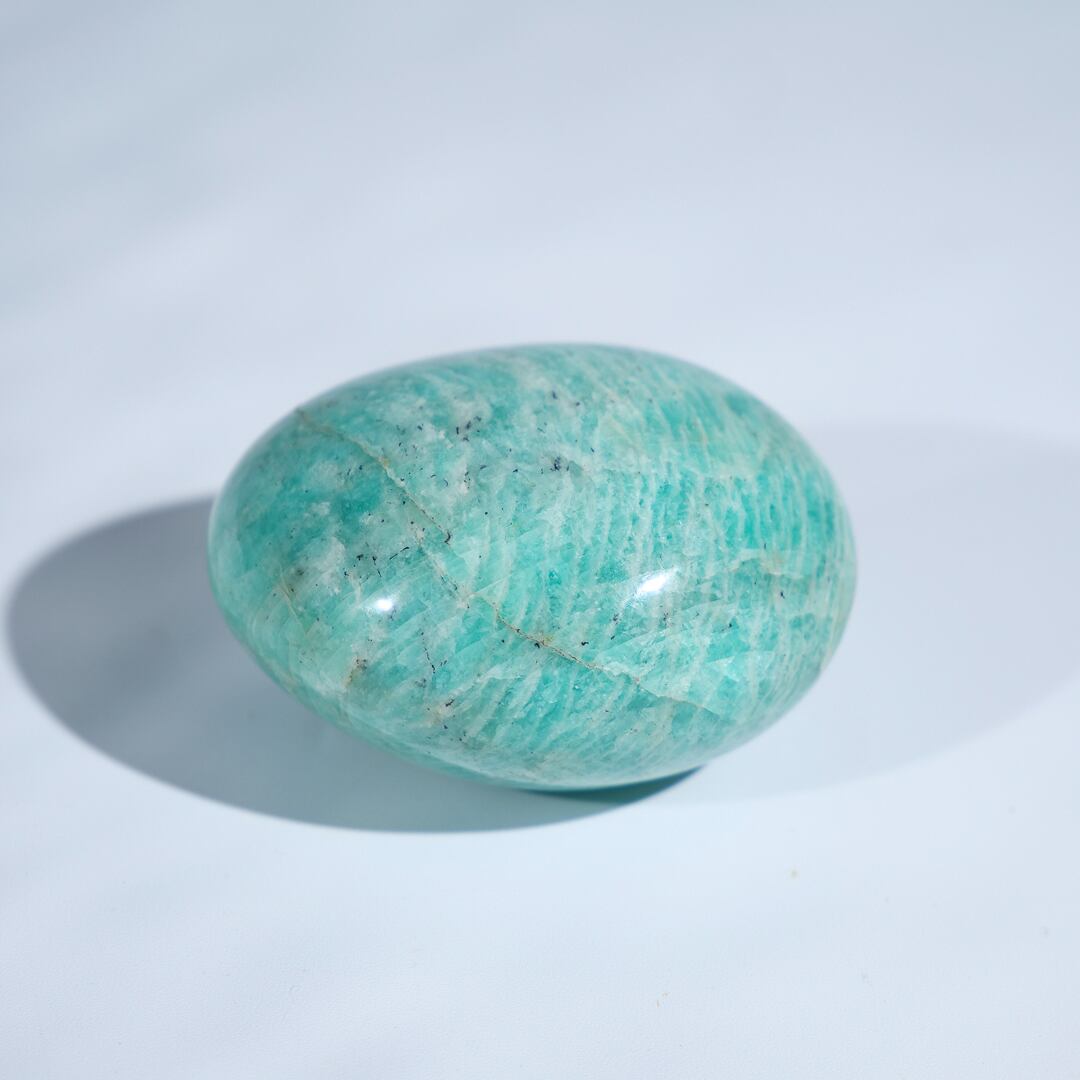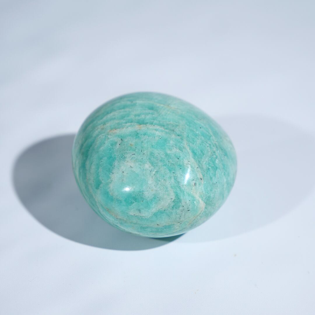 鮮やかな青緑色と白色の模様が美しい、アマゾナイト。