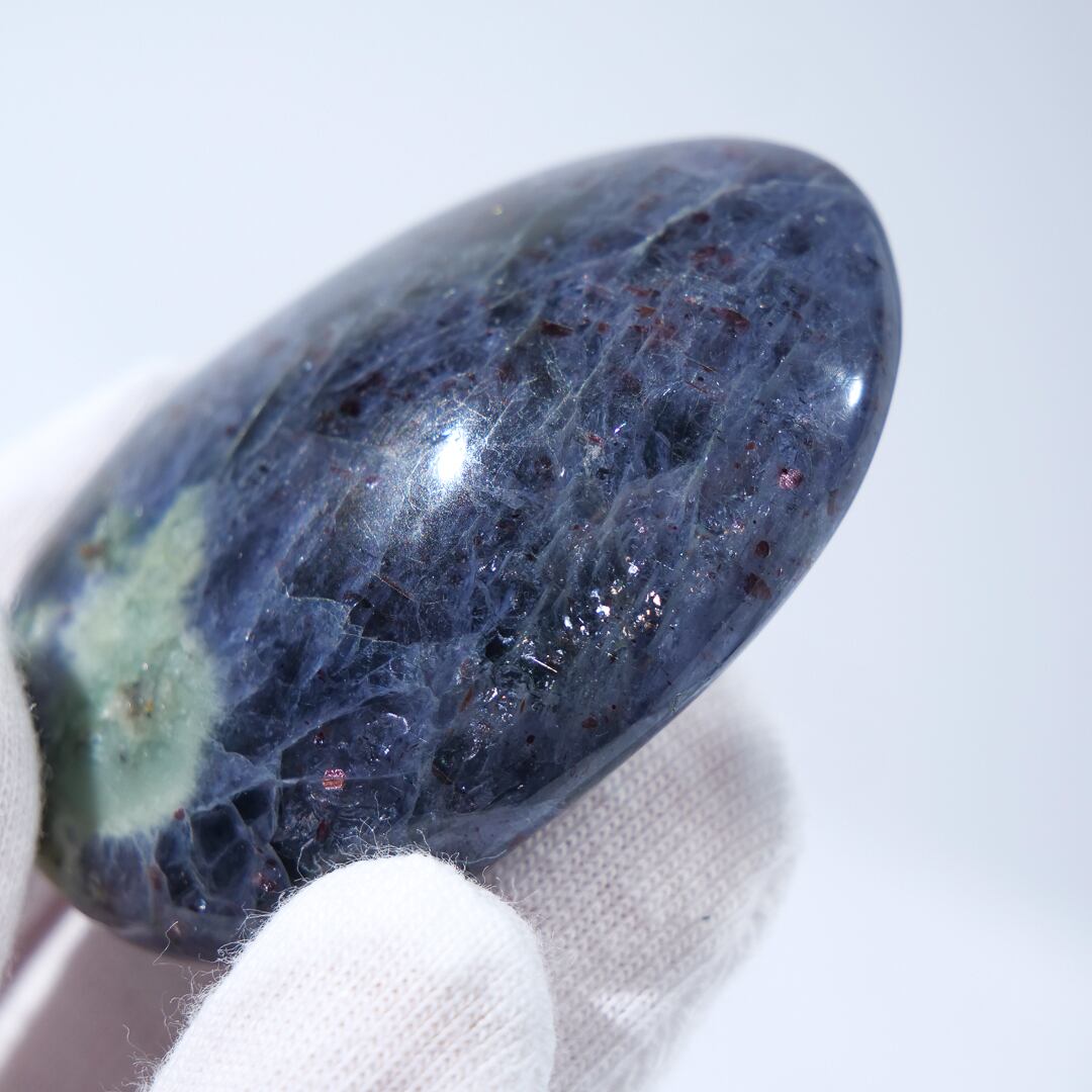 赤い斑点のような模様が見えるものは「ブラッドショット・アイオライト」と、多くの名前がある天然石です。(赤く輝く結晶はレピドクロサイトなどの鉄分と言われています)